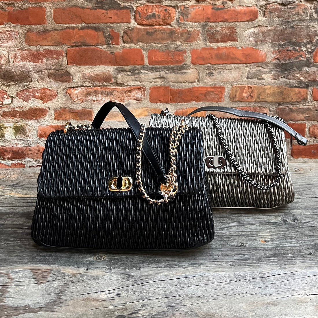 Borsa effetto trapuntato con patta e chiusura a clip con tracolla in metallo disponibile Nera...