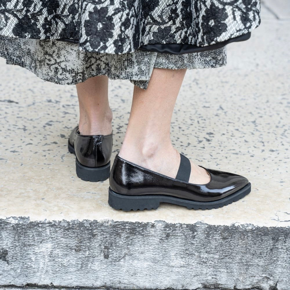 Décolleté a ballerina in vernice con elastico, punta sottile e suola track Plantare molto imbottito...
