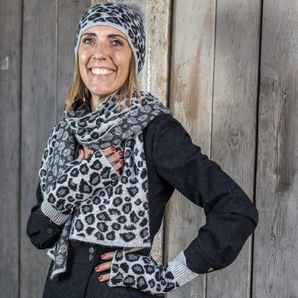 Sciarpa double-face maculata su base Nera, Grigia e Cuoio