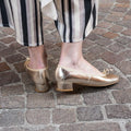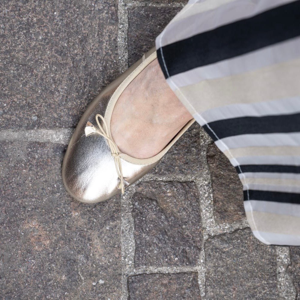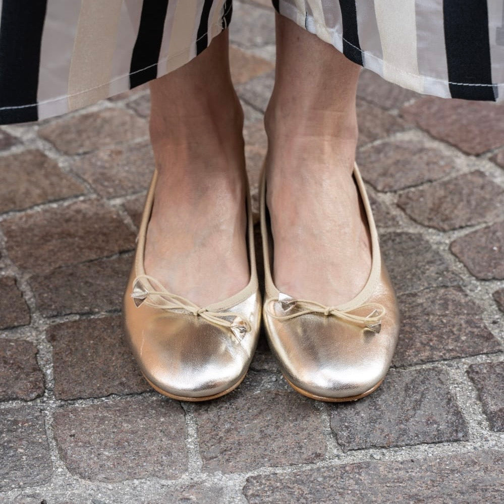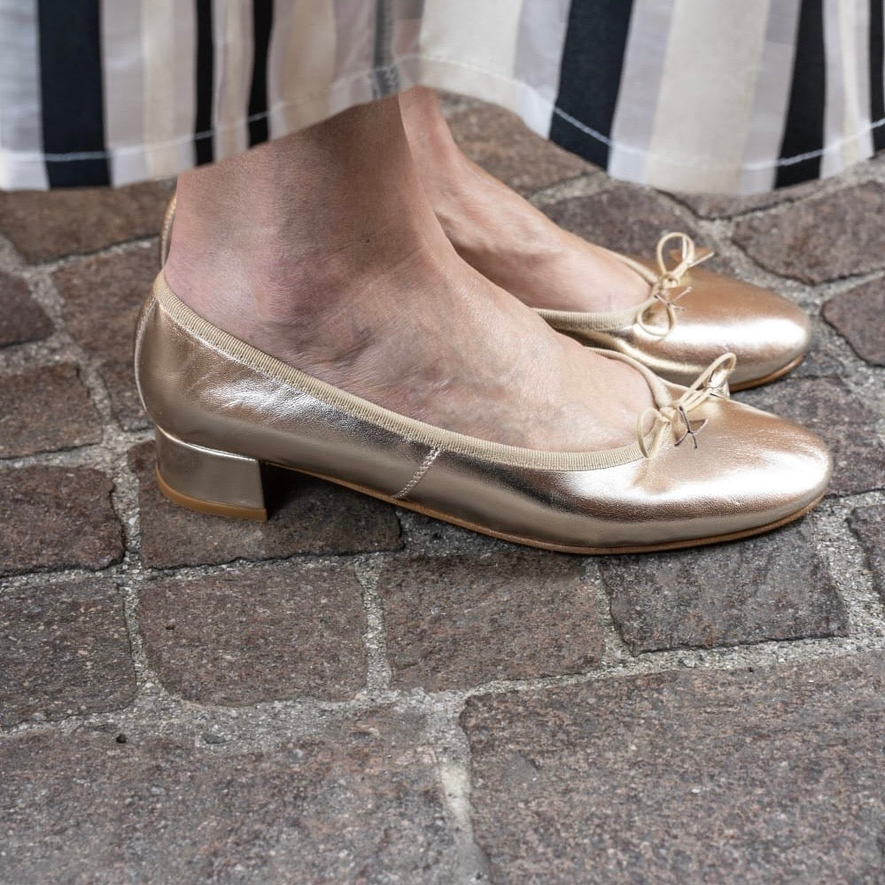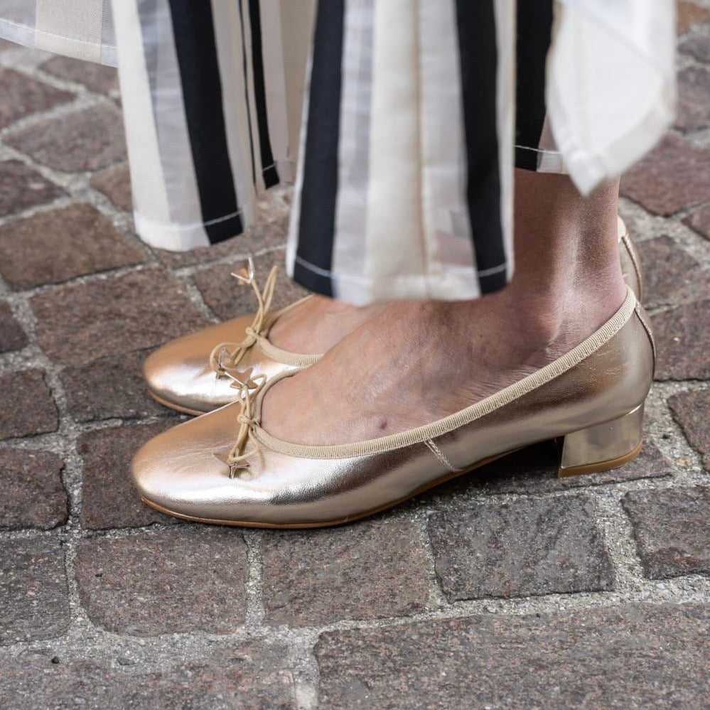 La Ballet iconica proposta su tacco 3 cm e realizzata in morbidissimo pellame laminato platino.Realizzata artigianalmente in Italia, in Veneto