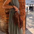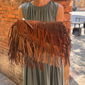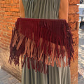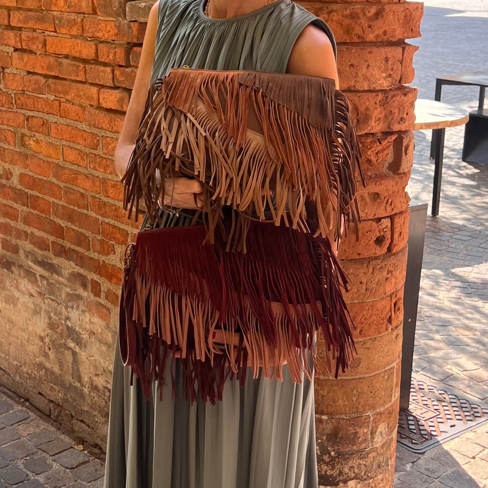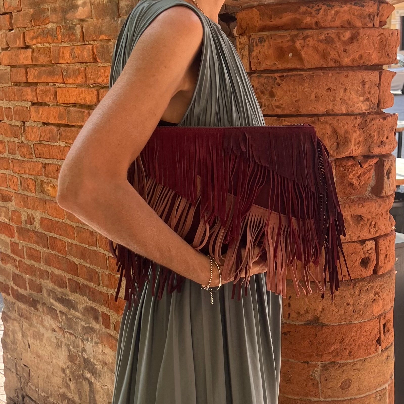 Borsa a busta con manico staccabile con frange in colore degradato disponibile Bordeaux e Cuoio