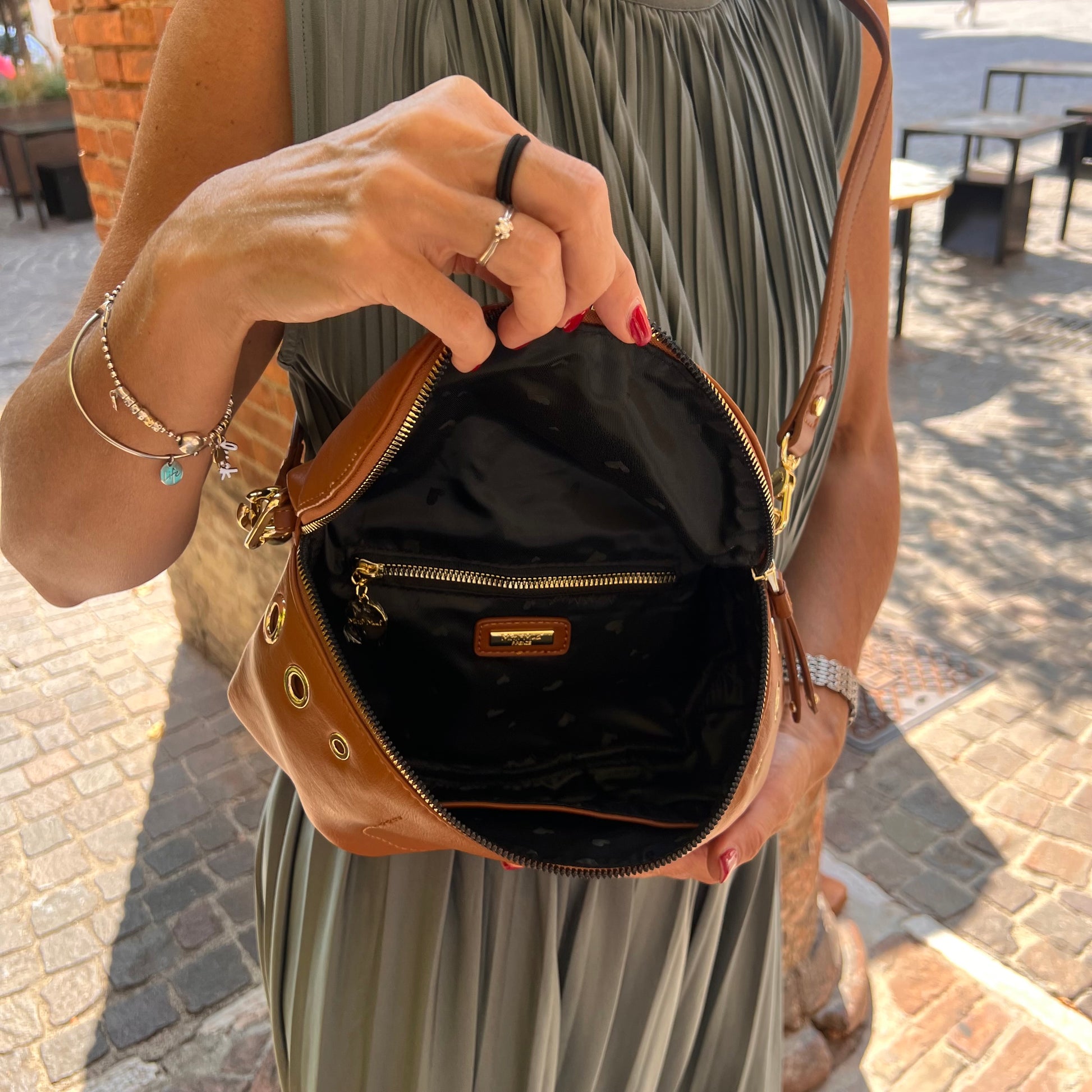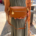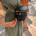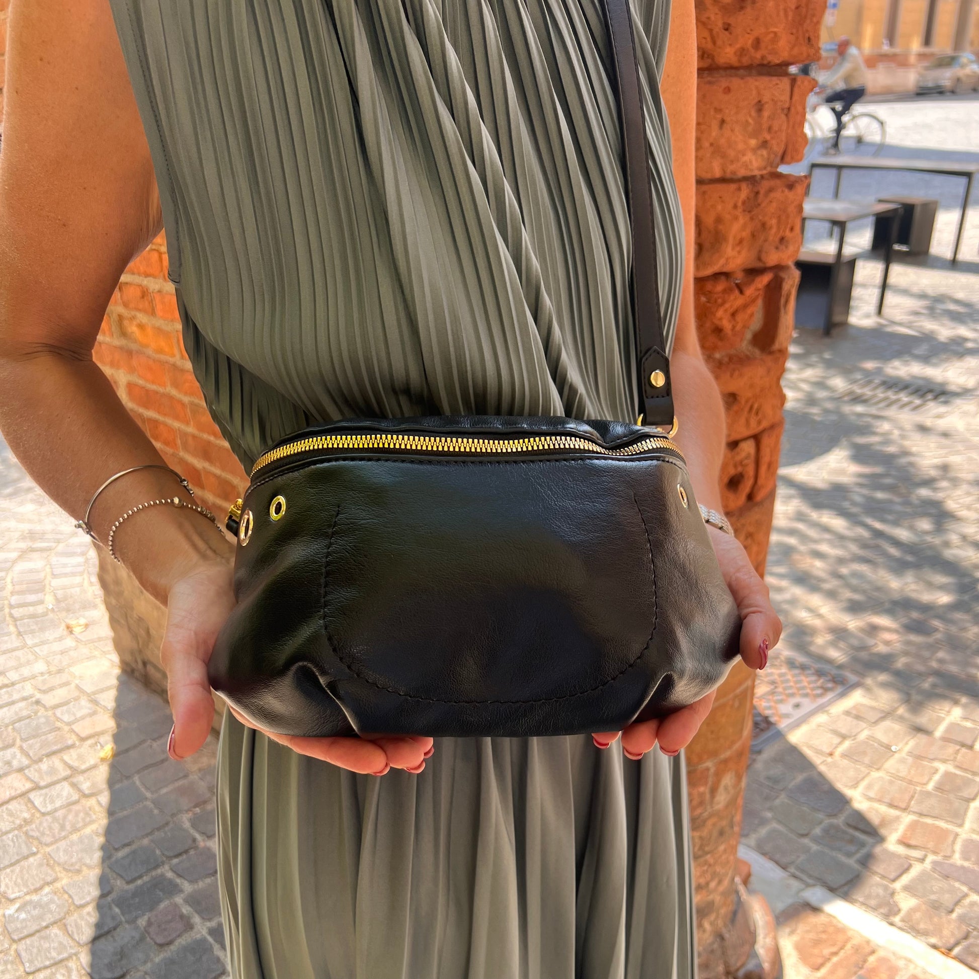 Borsa marsupio con tracolla regolabile, dettagli dorati e zip posteriore