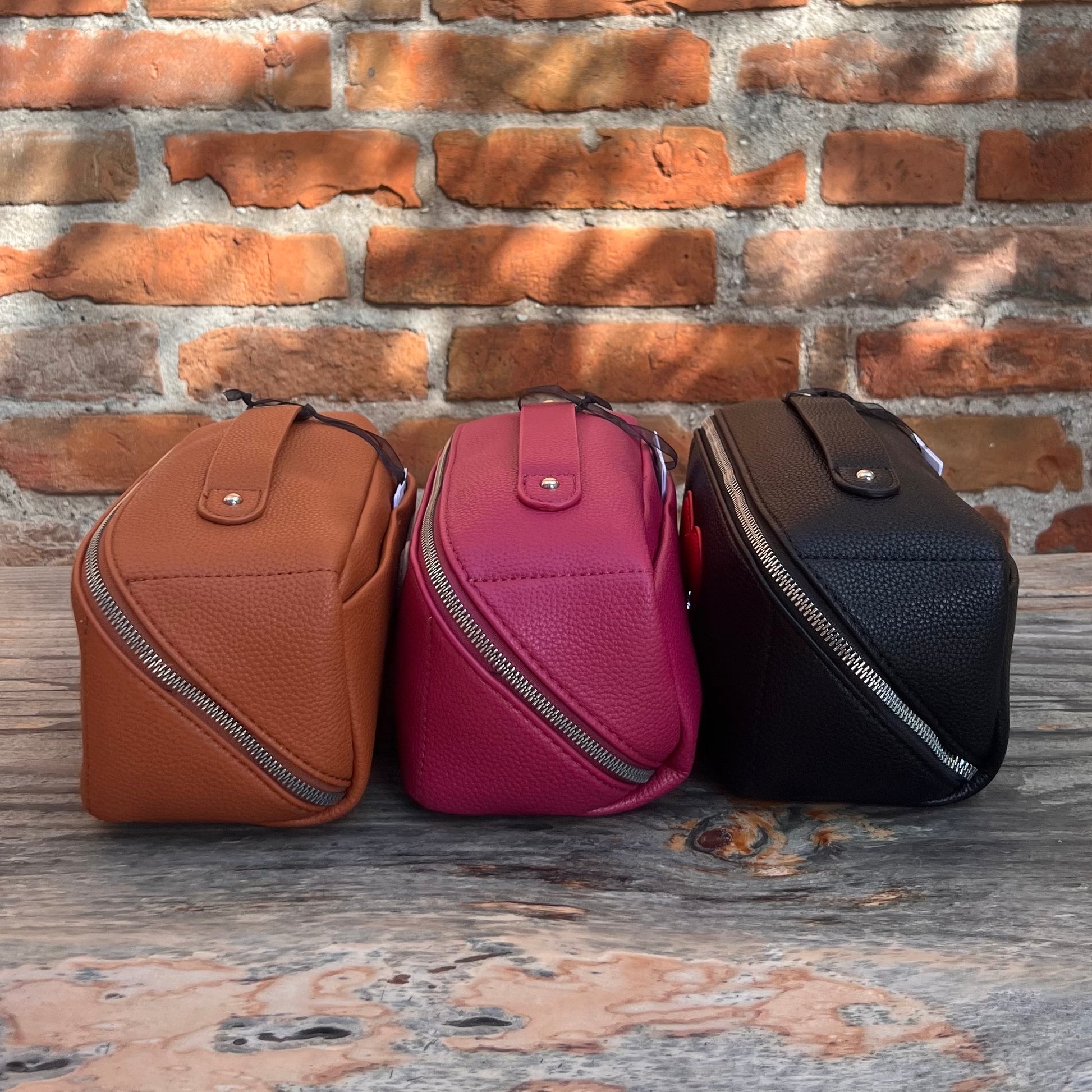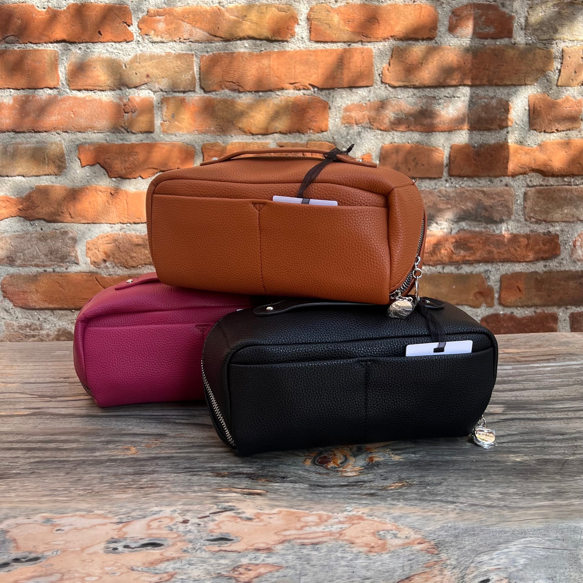 Disponibile in tre colori Nero, Cuoio e Rosa