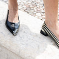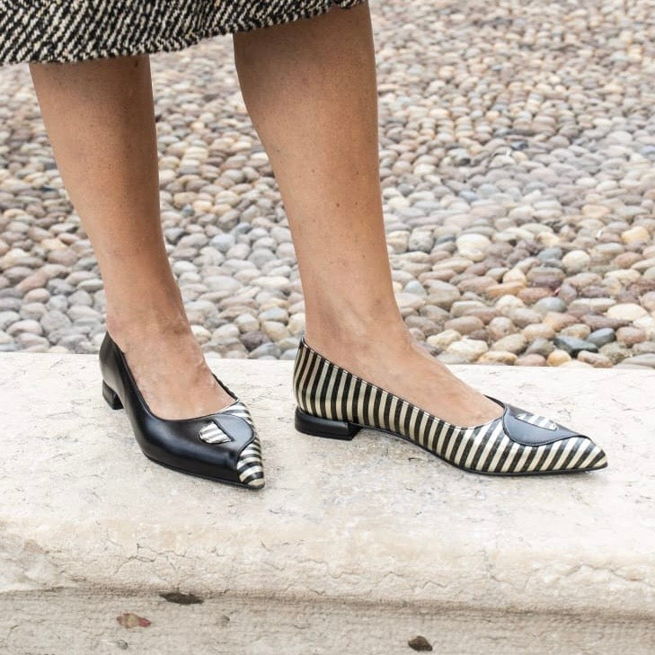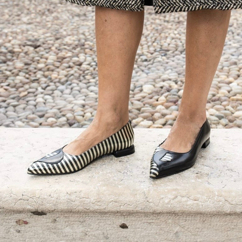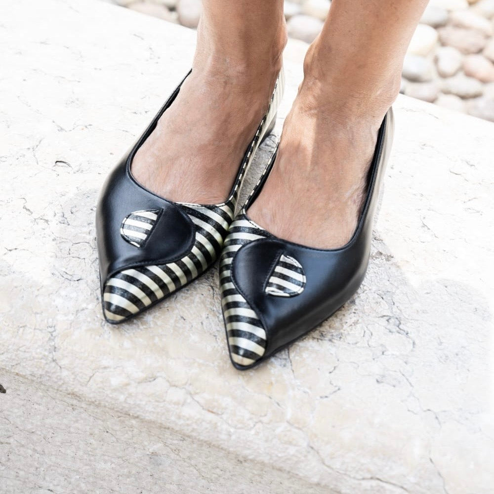 Décolleté per non passare inosservata realizzato in pregiato vitello metà nero e metà millerighe nero-oro