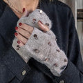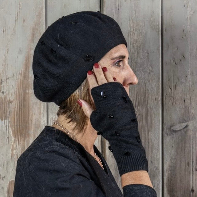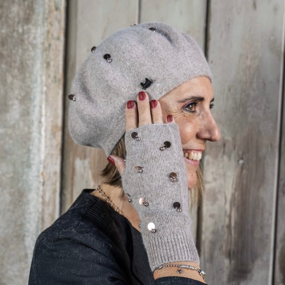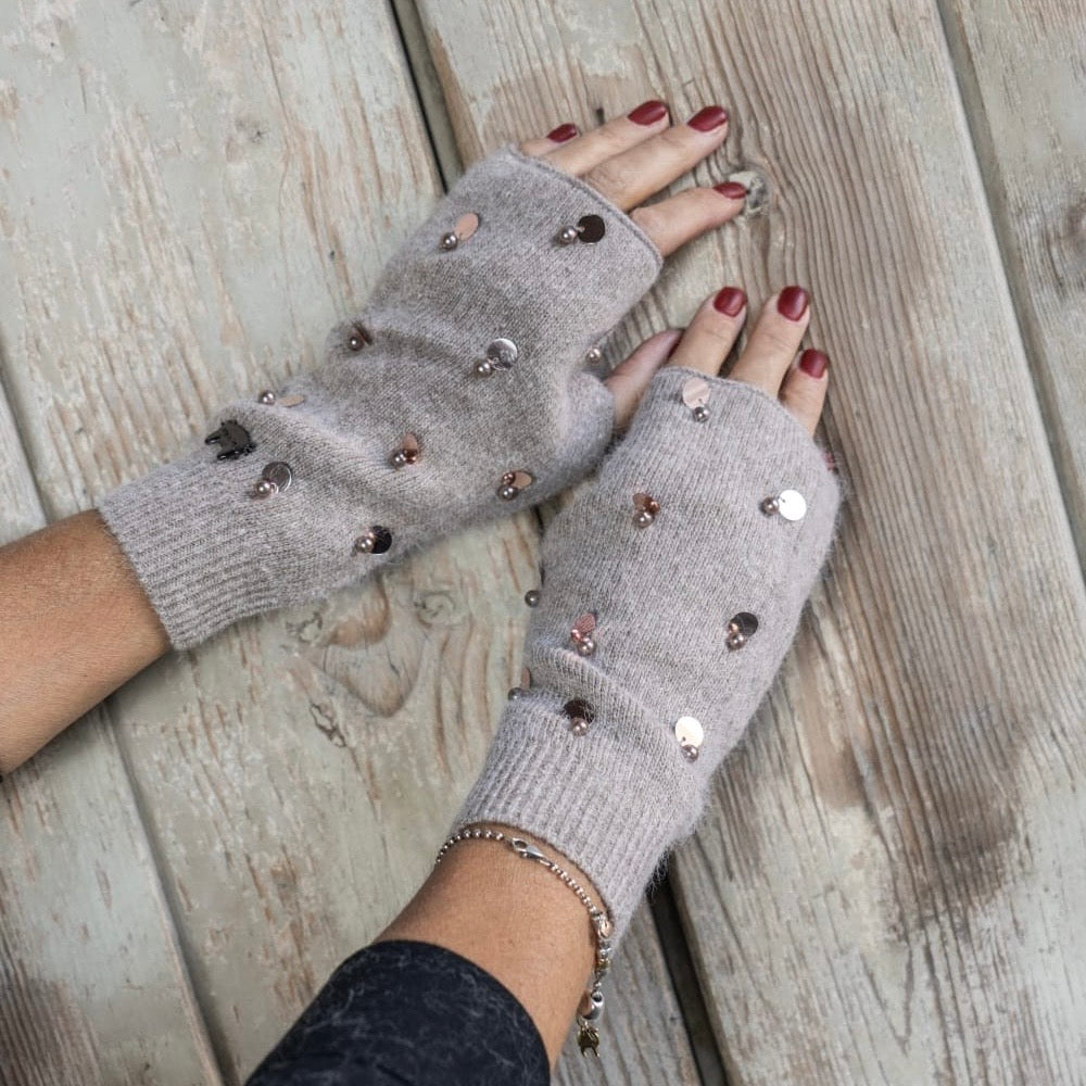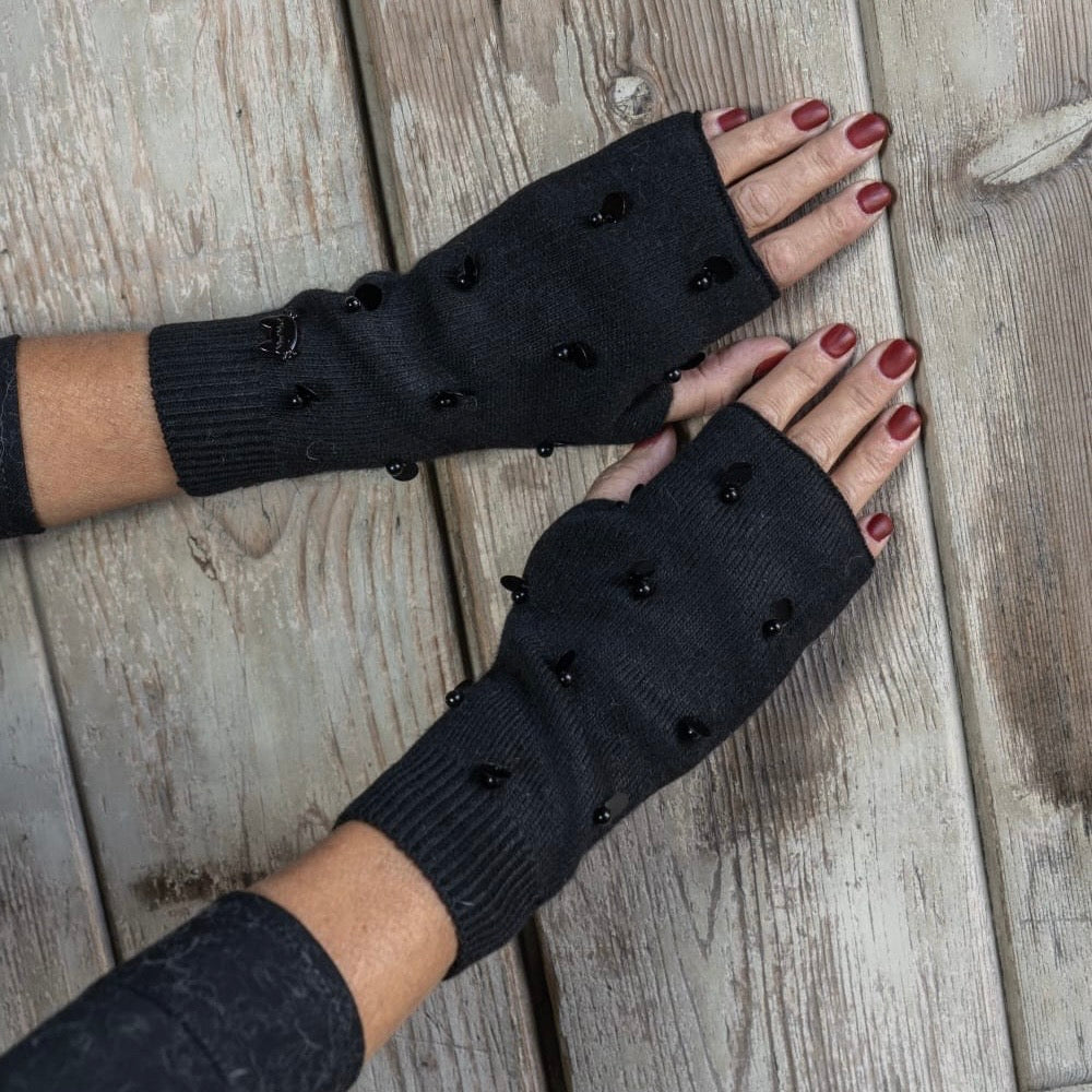 Guanti a manicotto con 8% di angora dettaglio perle e paillettes disponibili Nero e Fango