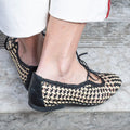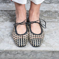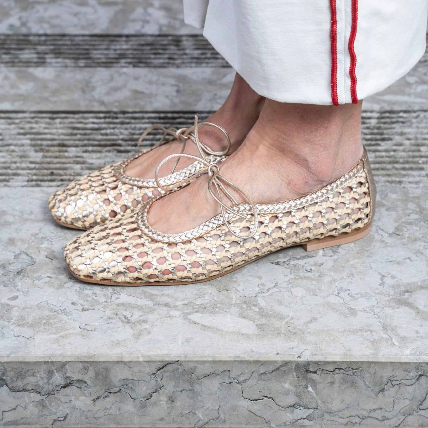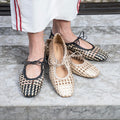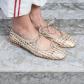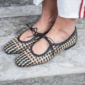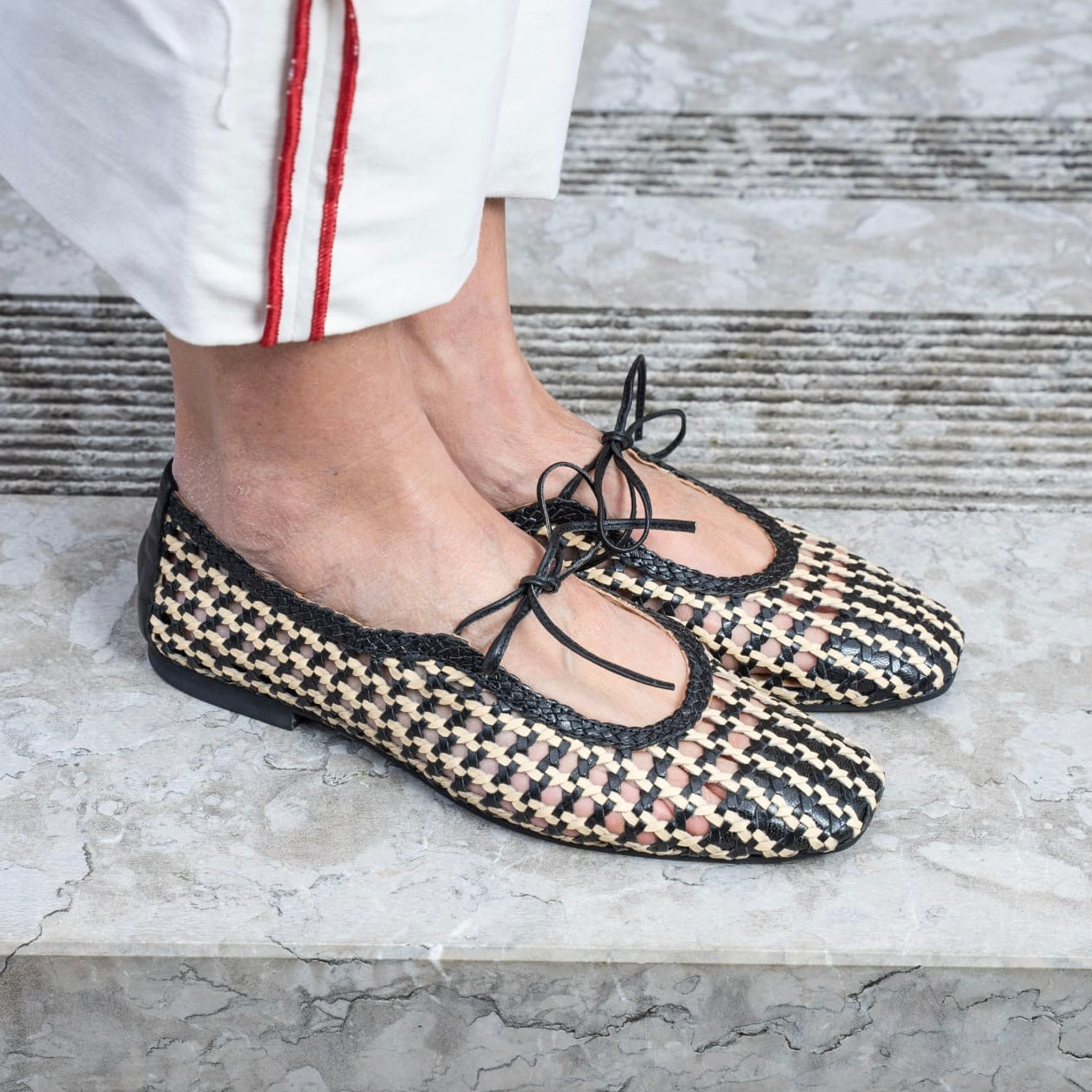 Mary Jane punta quadratina,allacciata sul collo del piede, in pelle con intreccio bicolore fatto a mano, molto flessibile e leggera perché priva di contrafforti. Adatta a piedi con alluce valgo