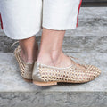 Questo modello si distingue per flessibilità e leggerezza, poiché elimina i fermi e i contrafforti. Il retro ripiegabile permette di trasformarle in mules. Eventuali variazioni nella pelle o nella finitura tra i due piedi riflettono l'autenticità del processo artigianale e l'uso di pellami naturali
