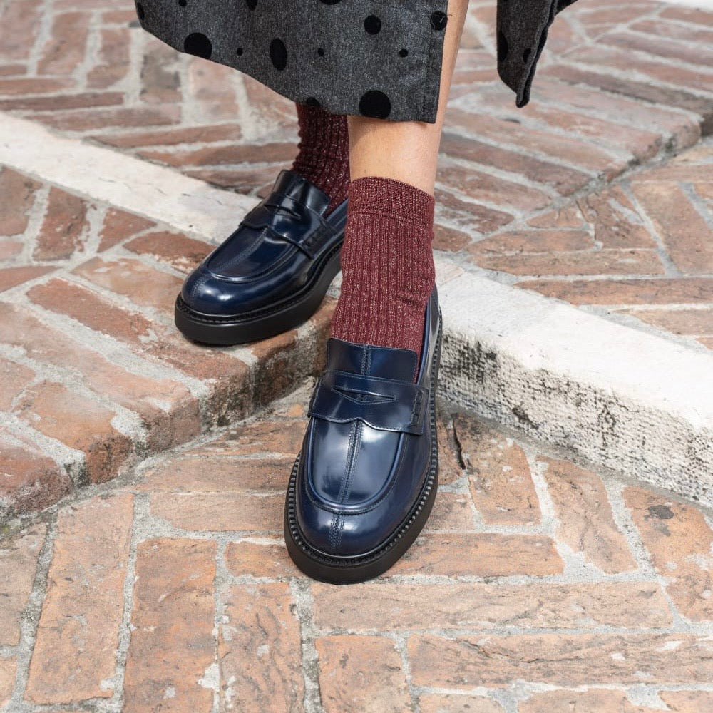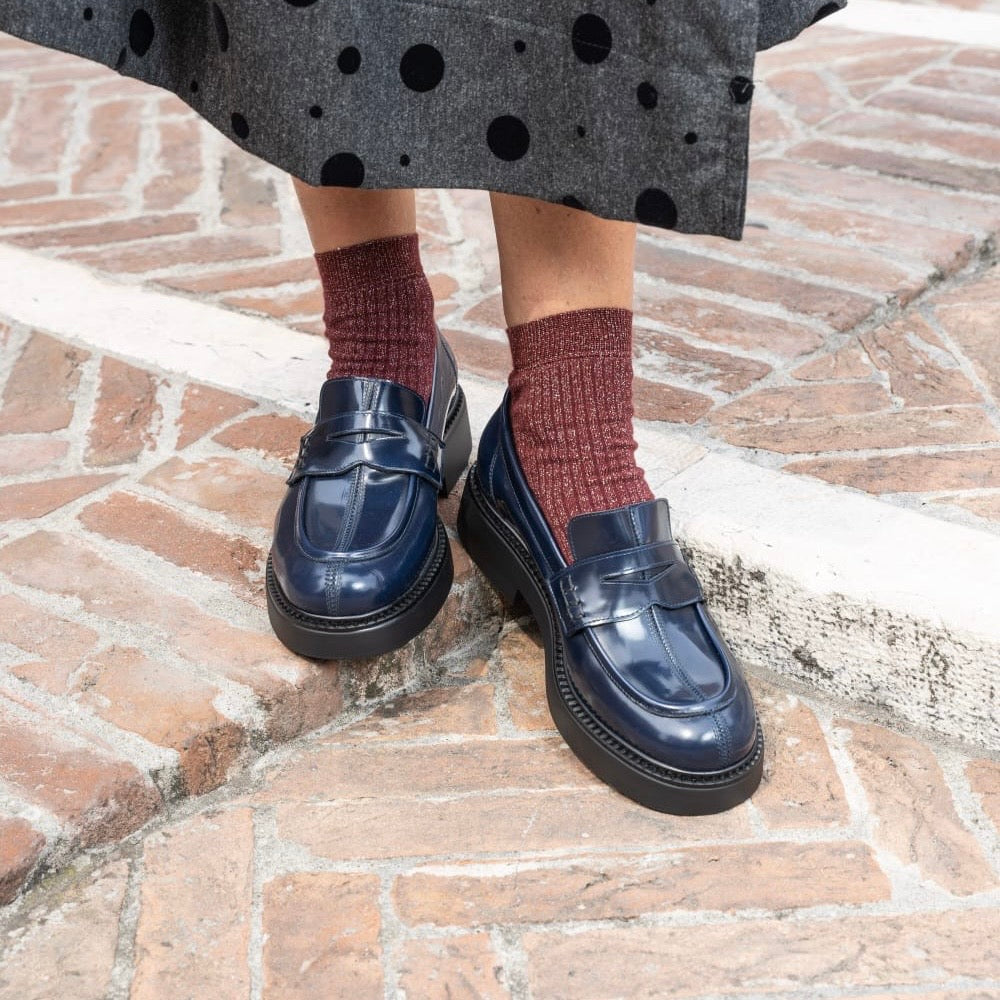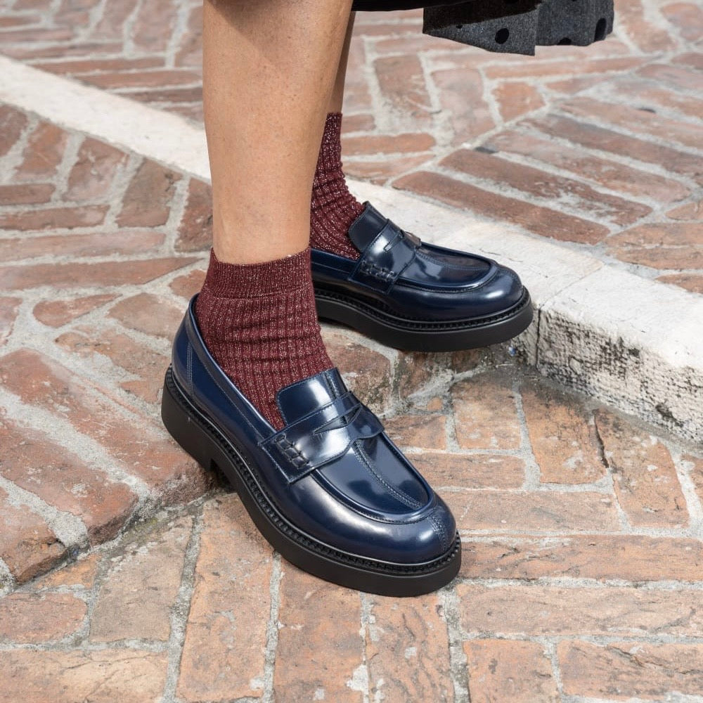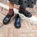 Mocassino a college con impugnatura a vista sulla tomaia realizzato in vitello spazzolato Nero e Blu