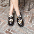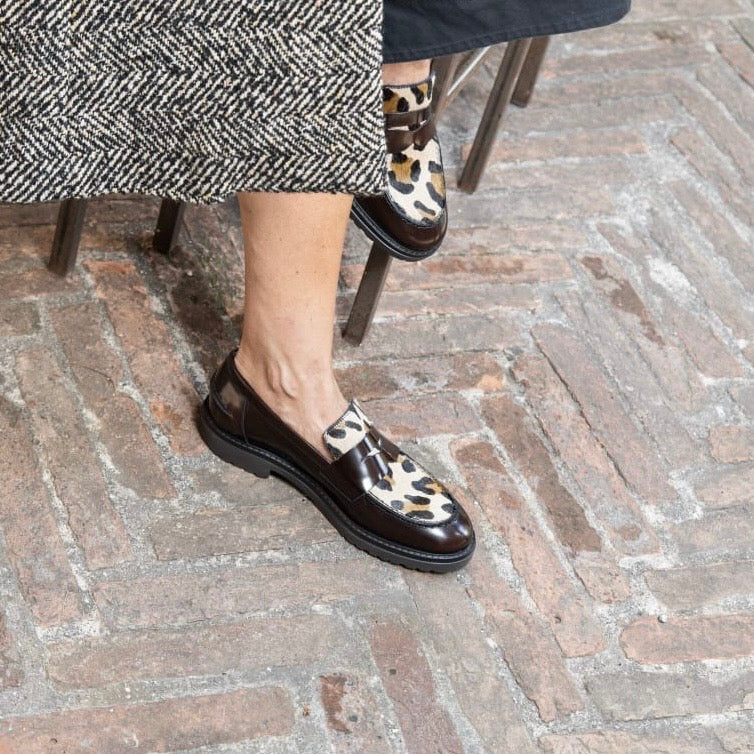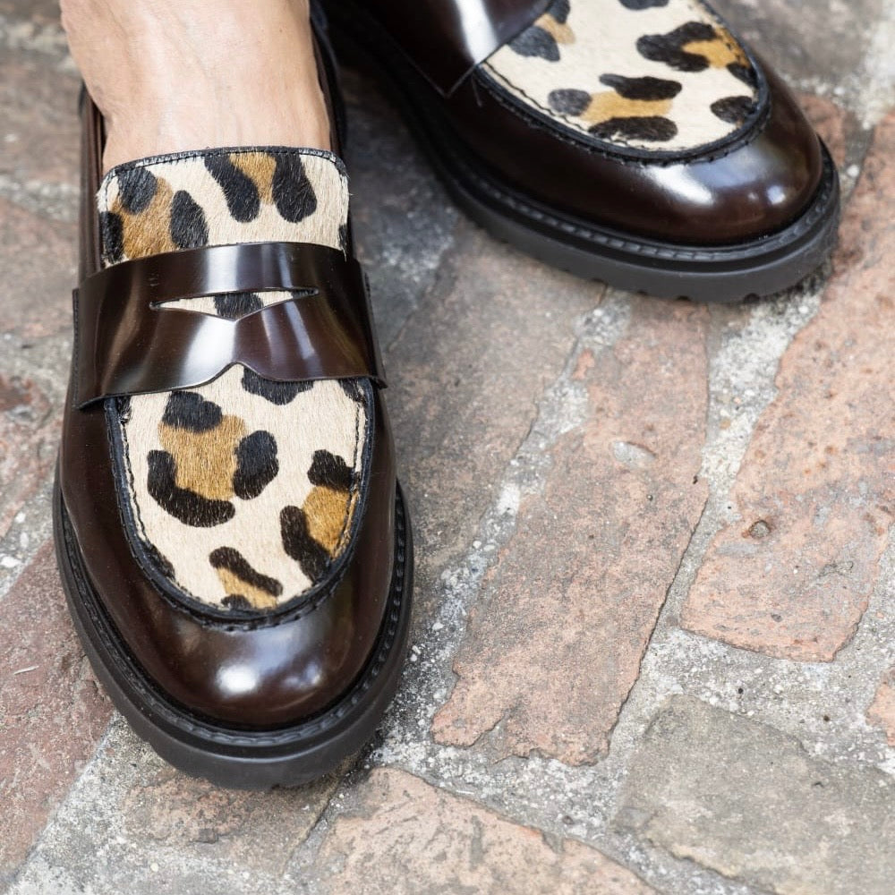 Mocassino college realizzato in pelle spazzola testa di moro con mascherina in cavallino maculato