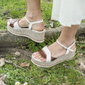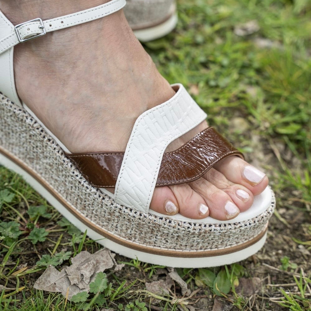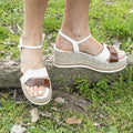 Sandalo con doppio listino asimmetrico a contrasto di colori e materiali, zeppa leggerissima in tessuto (posteriore 6,5cm e anteriore 3,5 cm).Prodotto artigianalmente in Campania da una ditta specializzata in modelli estivi