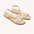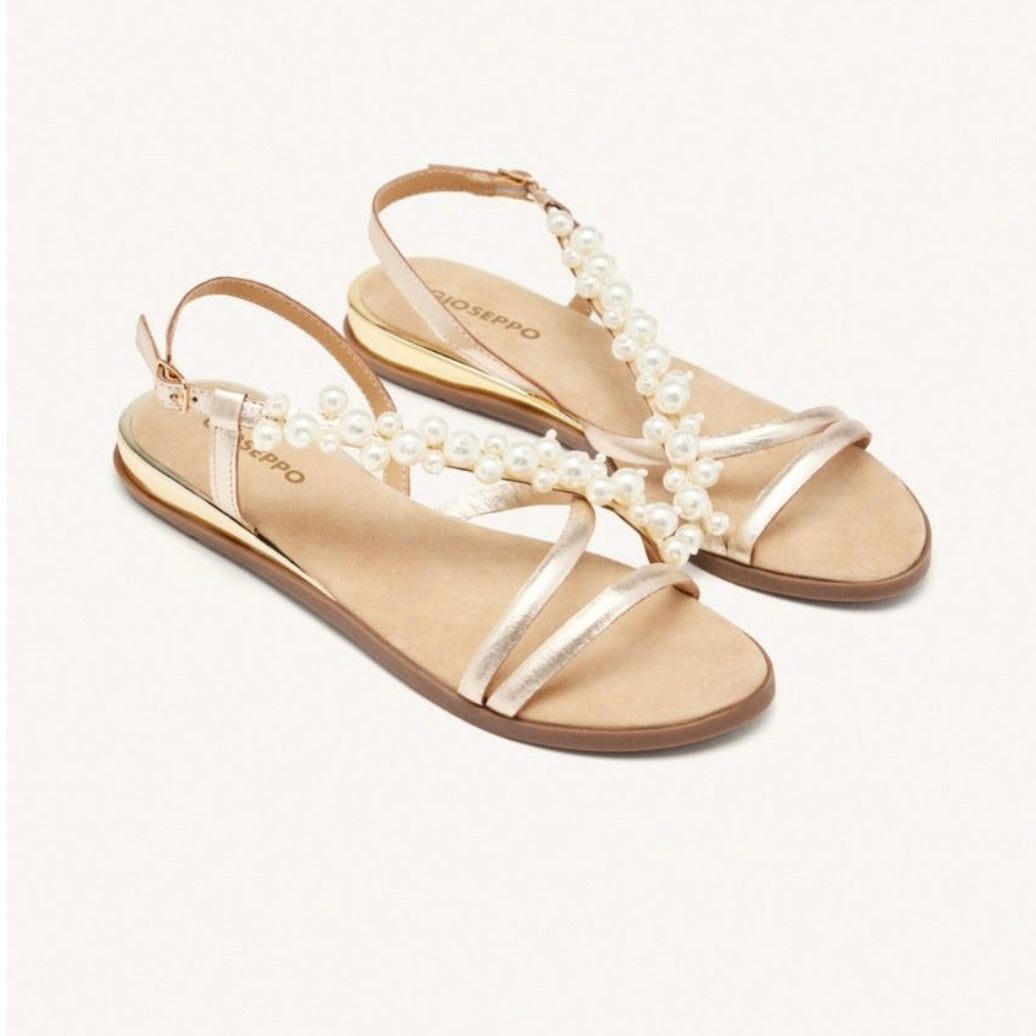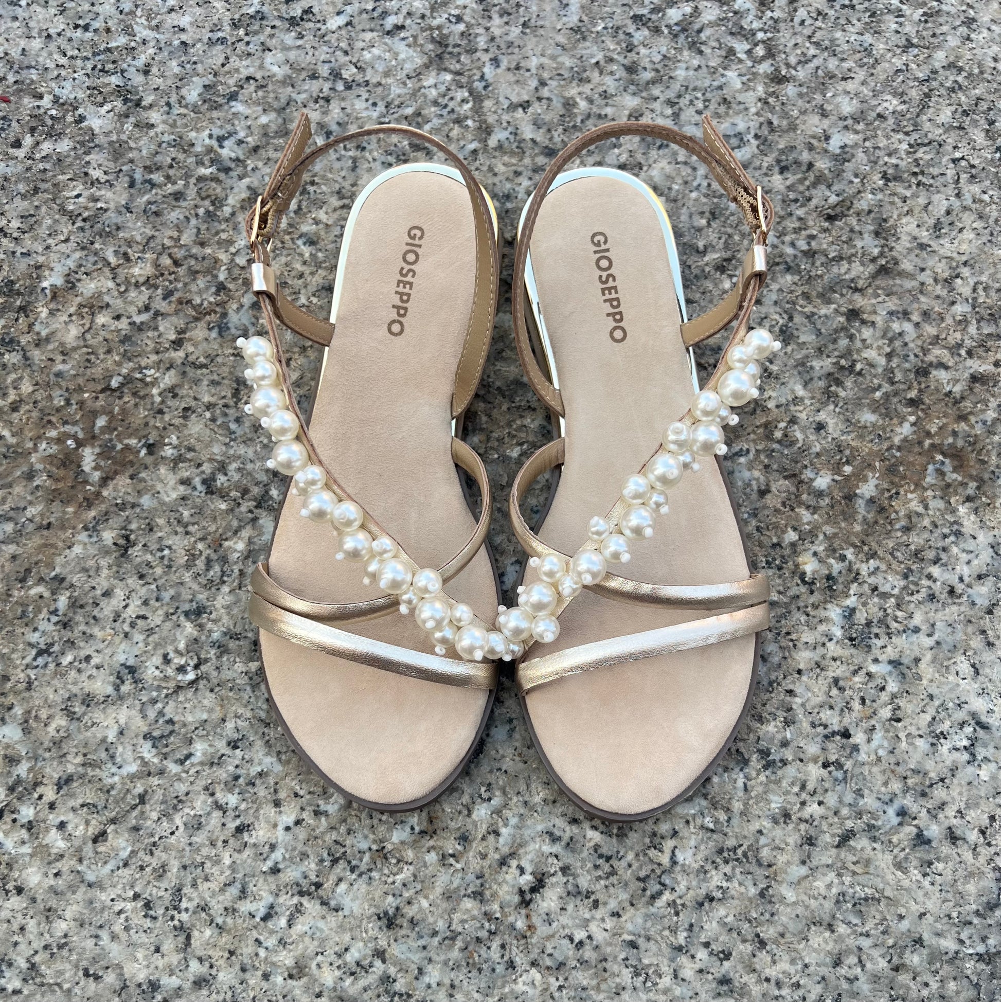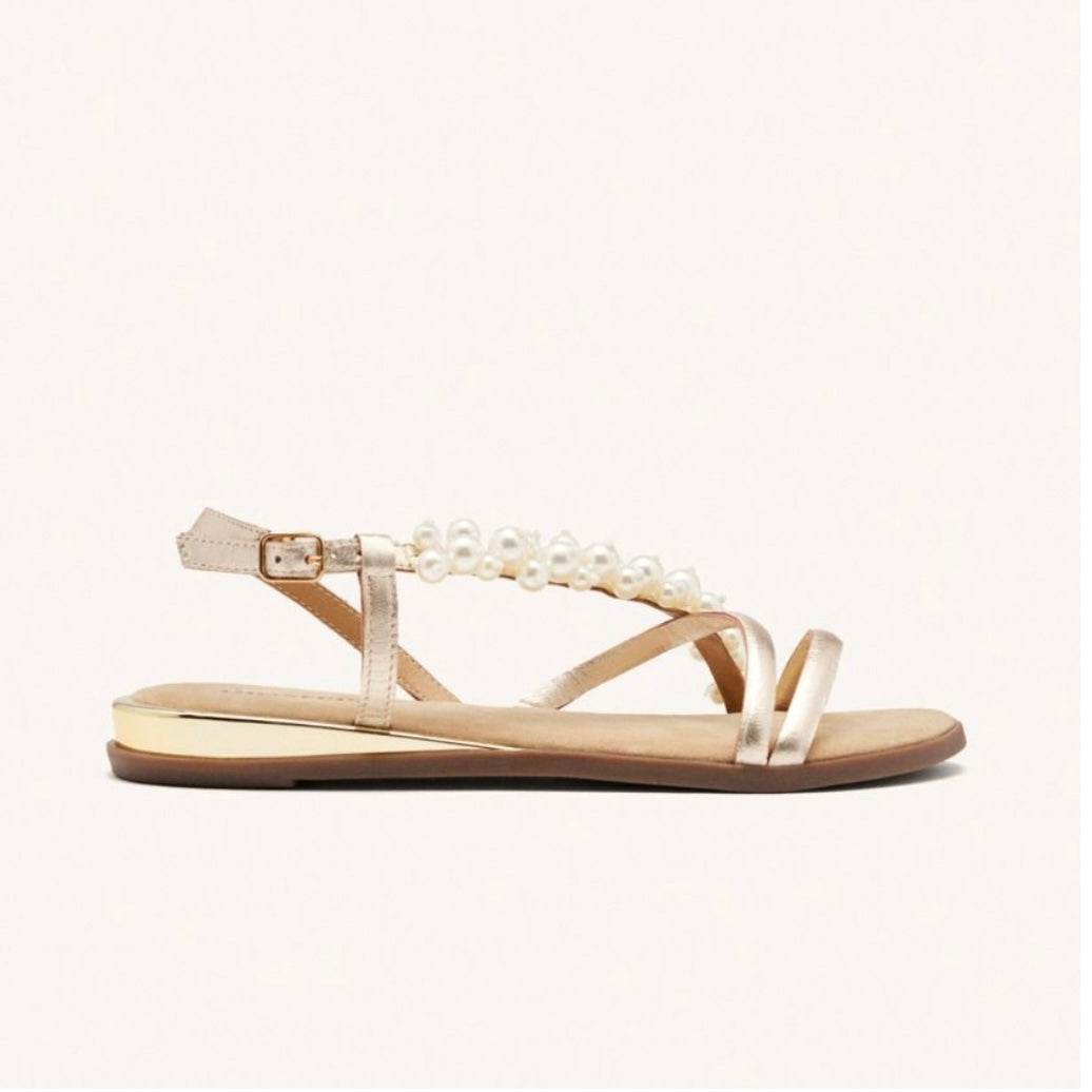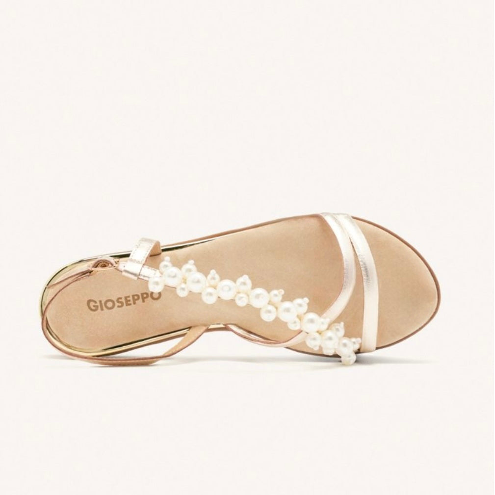 Sandalo zeppa in pelle con cinturini platino e decorazione in perle