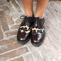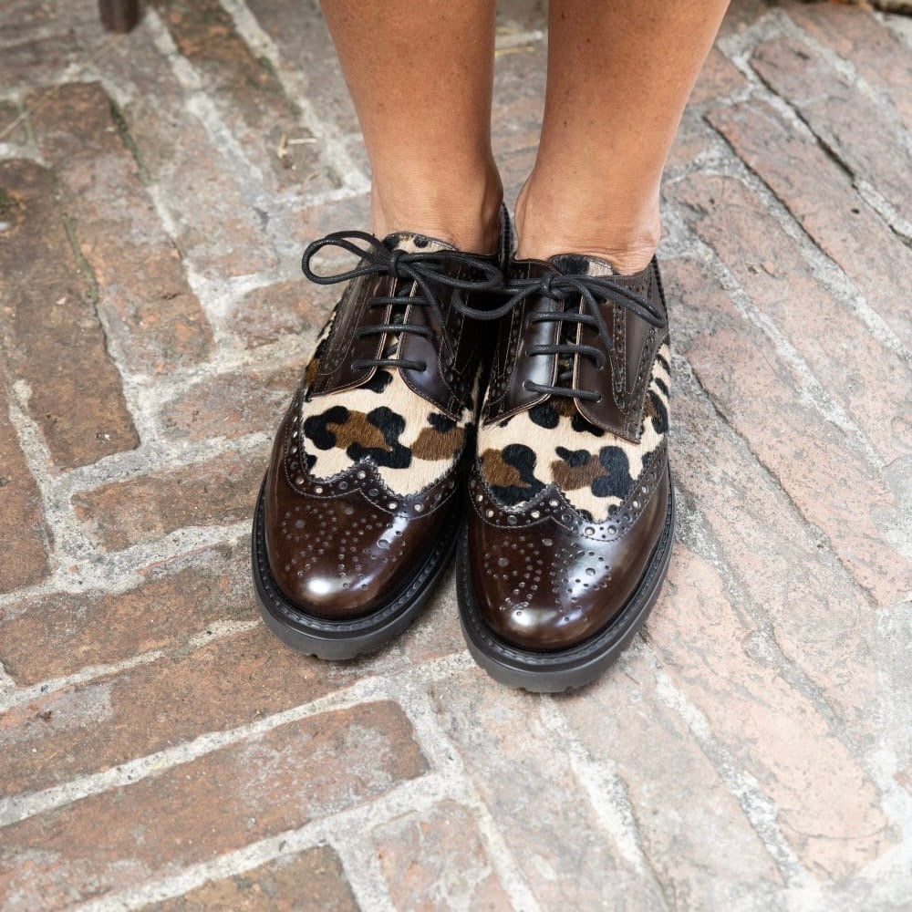 Scarpa derby allacciata con impunture all’inglese realizzata in pelle spazzola testa di moro con dettagli in cavallino maculato