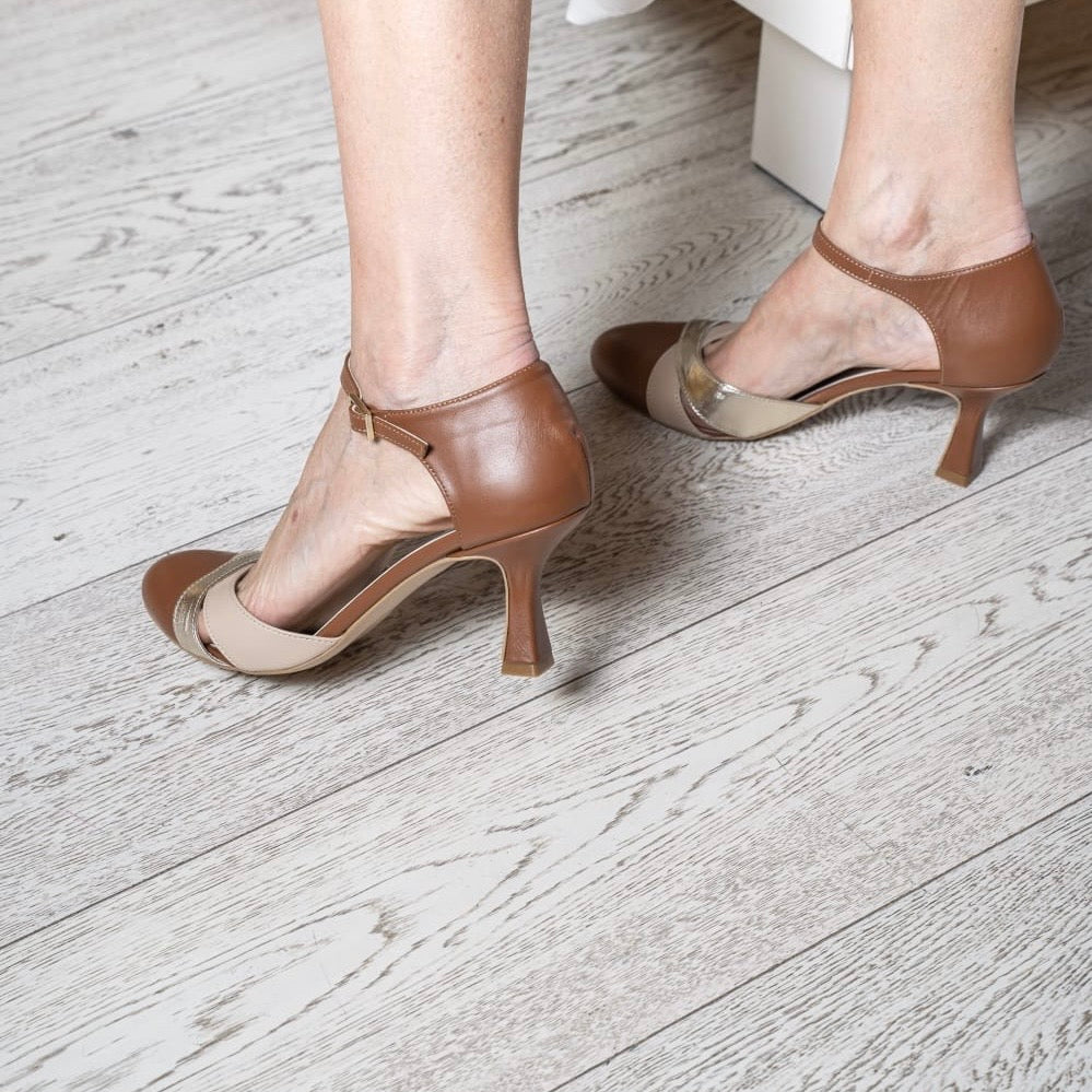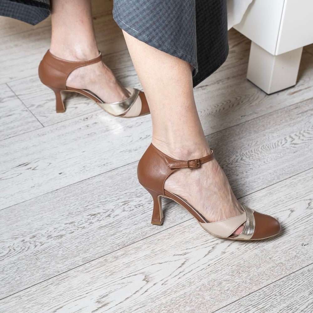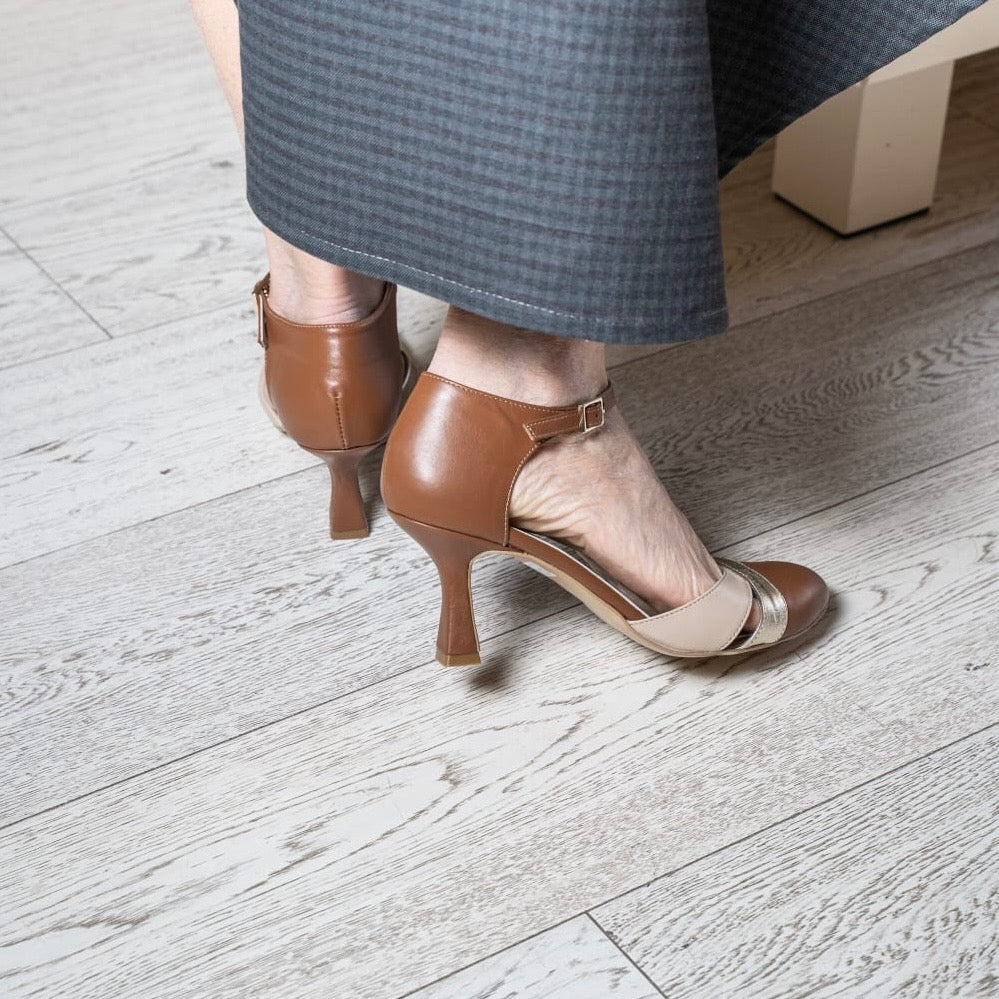 Scarpa con cinturino regolabile realizzata in nappa cuoio con incrocio sulla tomaia a contrasto Nude e Platino
