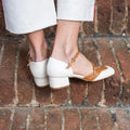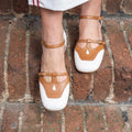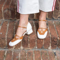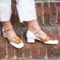 Scarpa aperta ai lati dal gusto retrò vintage con doppio cinturino regolabile, realizzata in morbidissima nappa latte e dettagli a contrasto in nappa nocciola