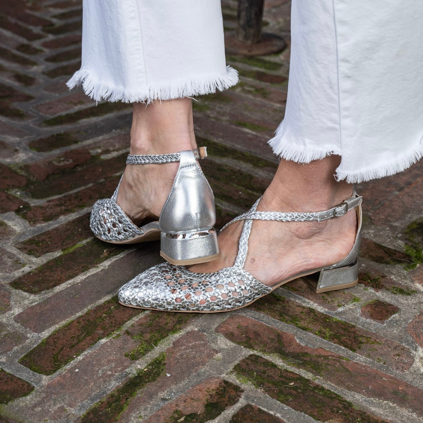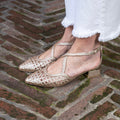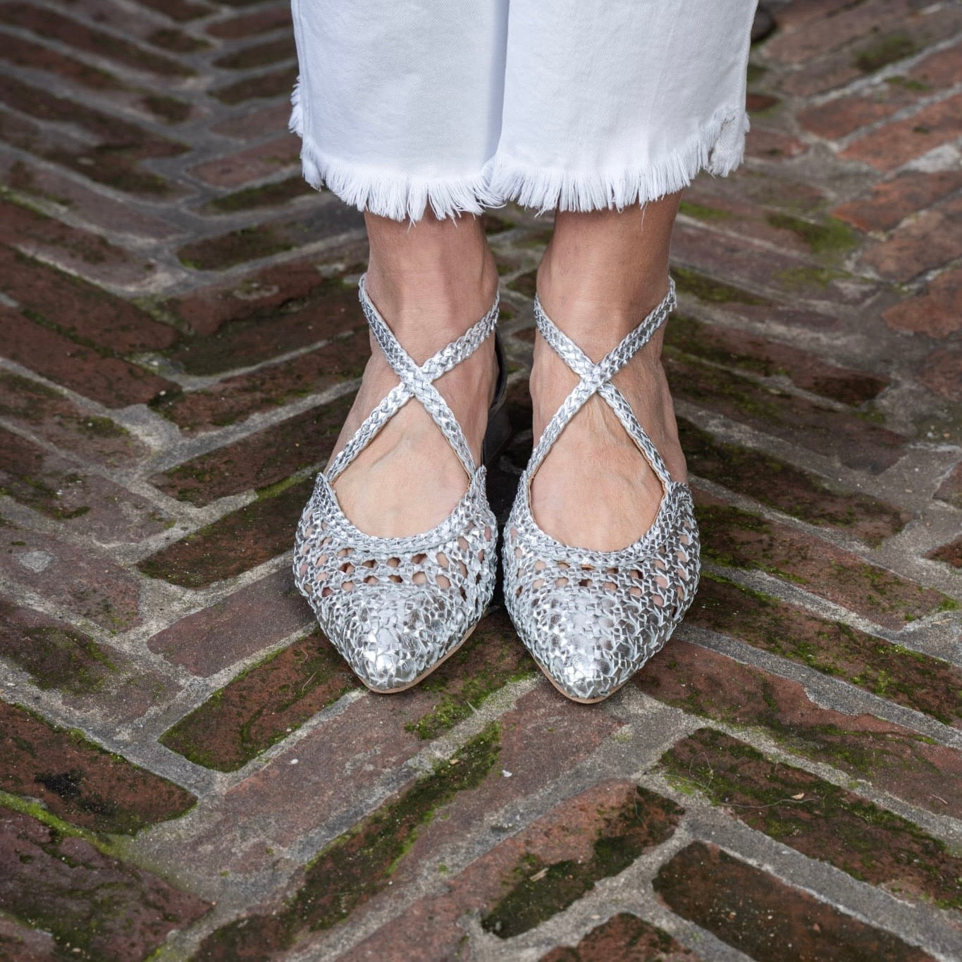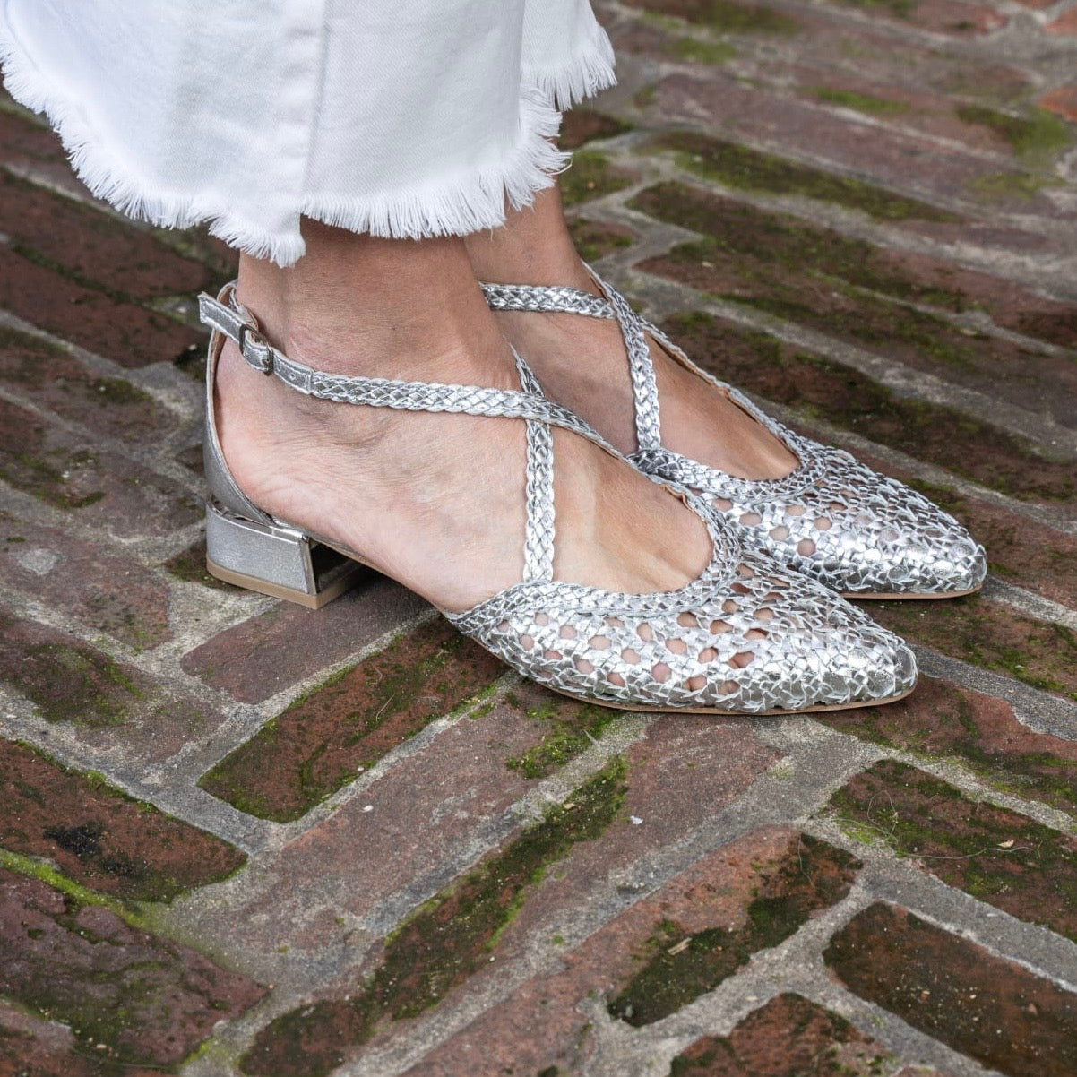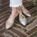 Scarpa aperta ai lati con cinturino incrociato sul collo del piede, in pelle intrecciata con punta sfilata.Chiusura regolabile alla caviglia per una maggiore tenuta. Disponibile Platino e Argento