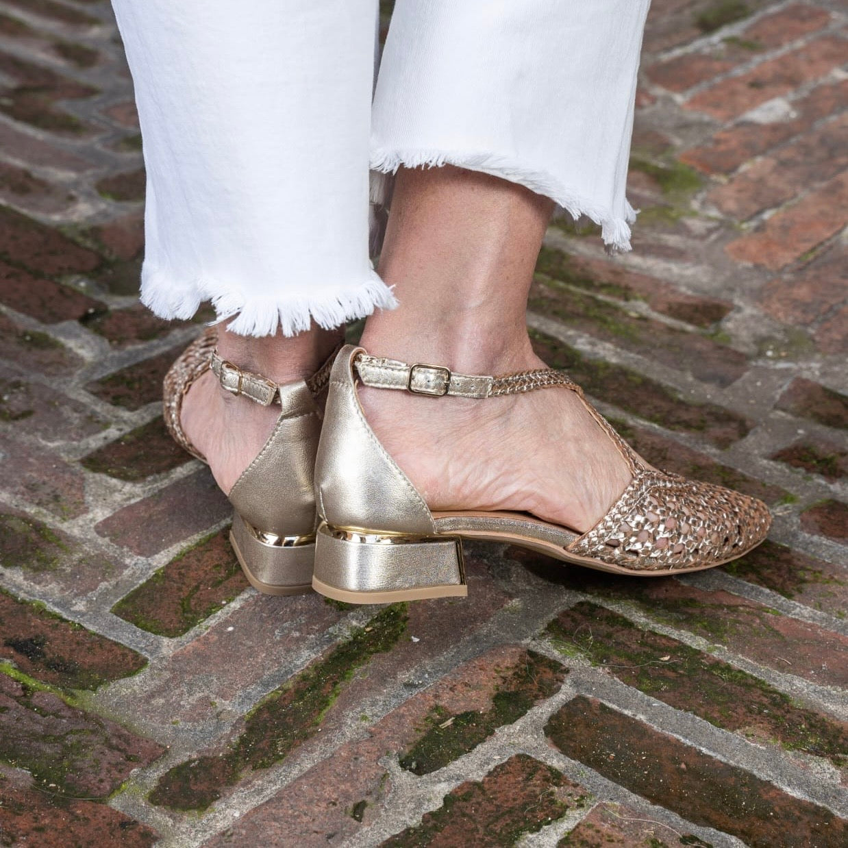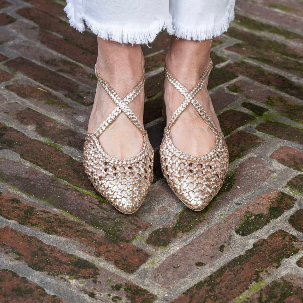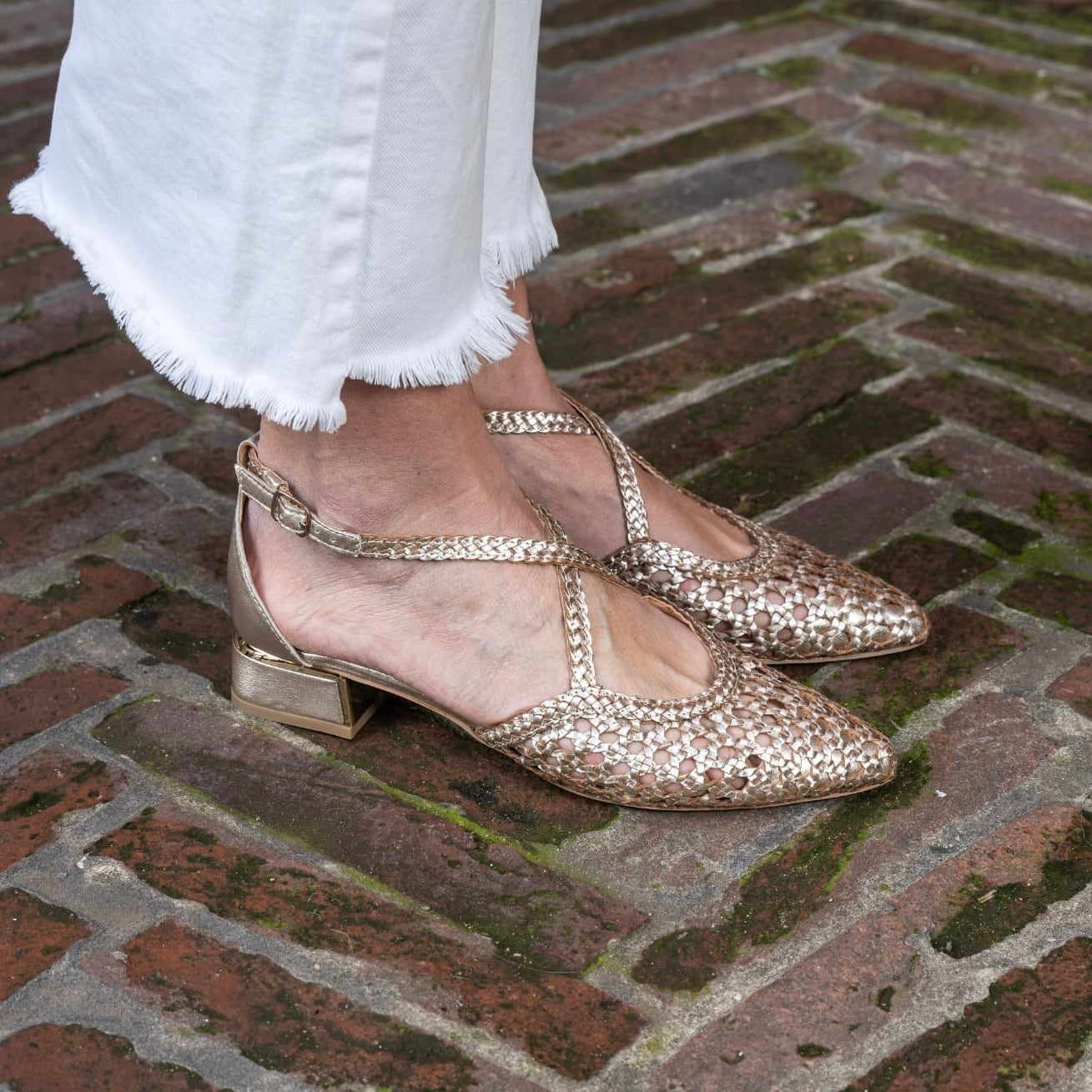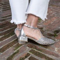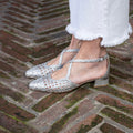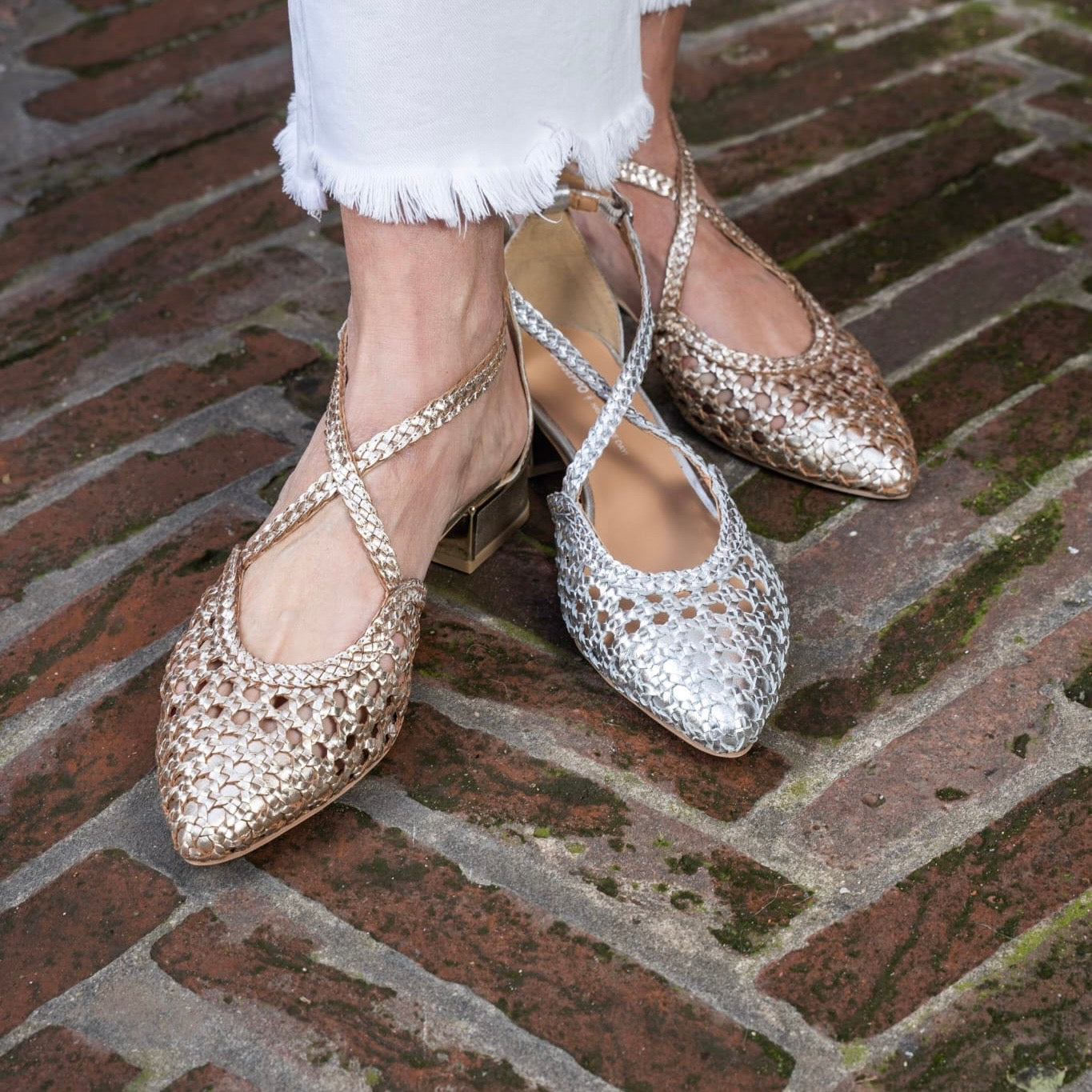 Scarpa aperta ai lati con cinturino incrociato sul collo del piede, in pelle intrecciata con punta sfilata.Chiusura regolabile alla caviglia per una maggiore tenuta. Disponibile Platino e Argento