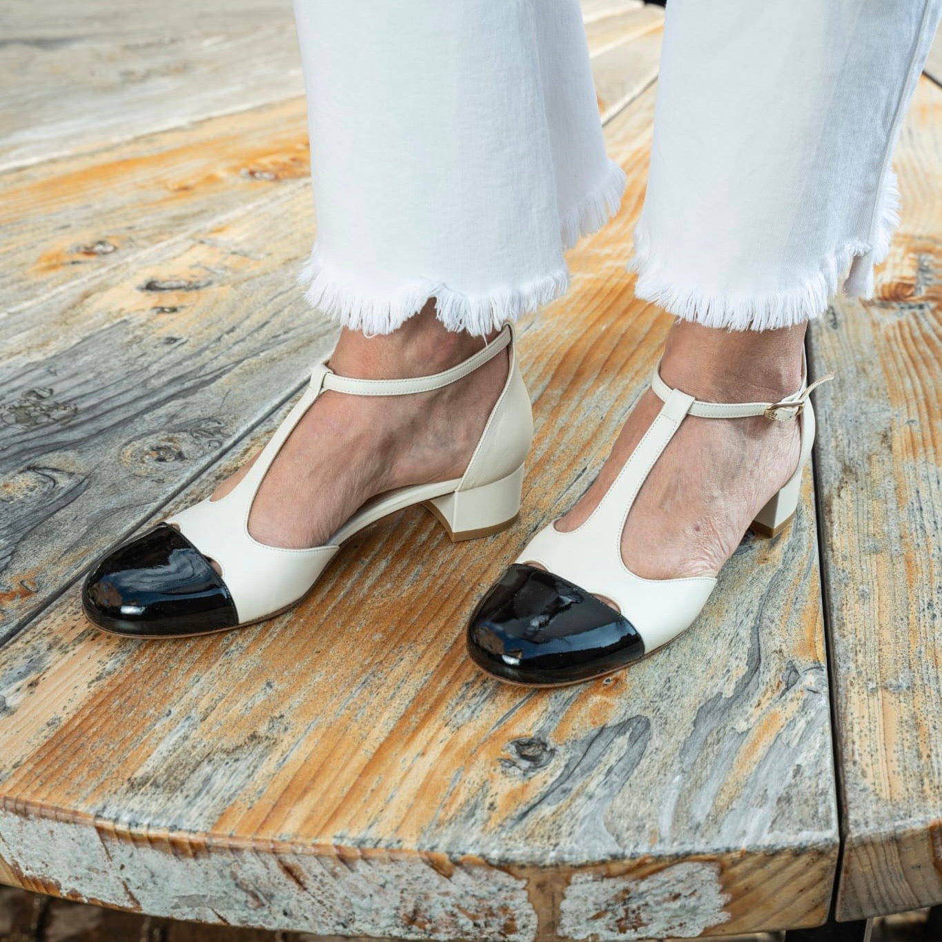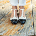 Nuove versioni per la t-bar più amata, realizzata in morbidissima pelle color latte con puntale a contrasto in pelle di vernice e cinturino regolabile