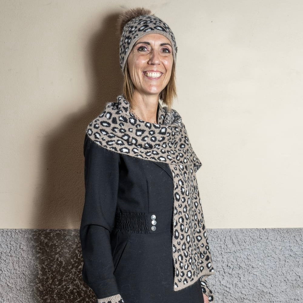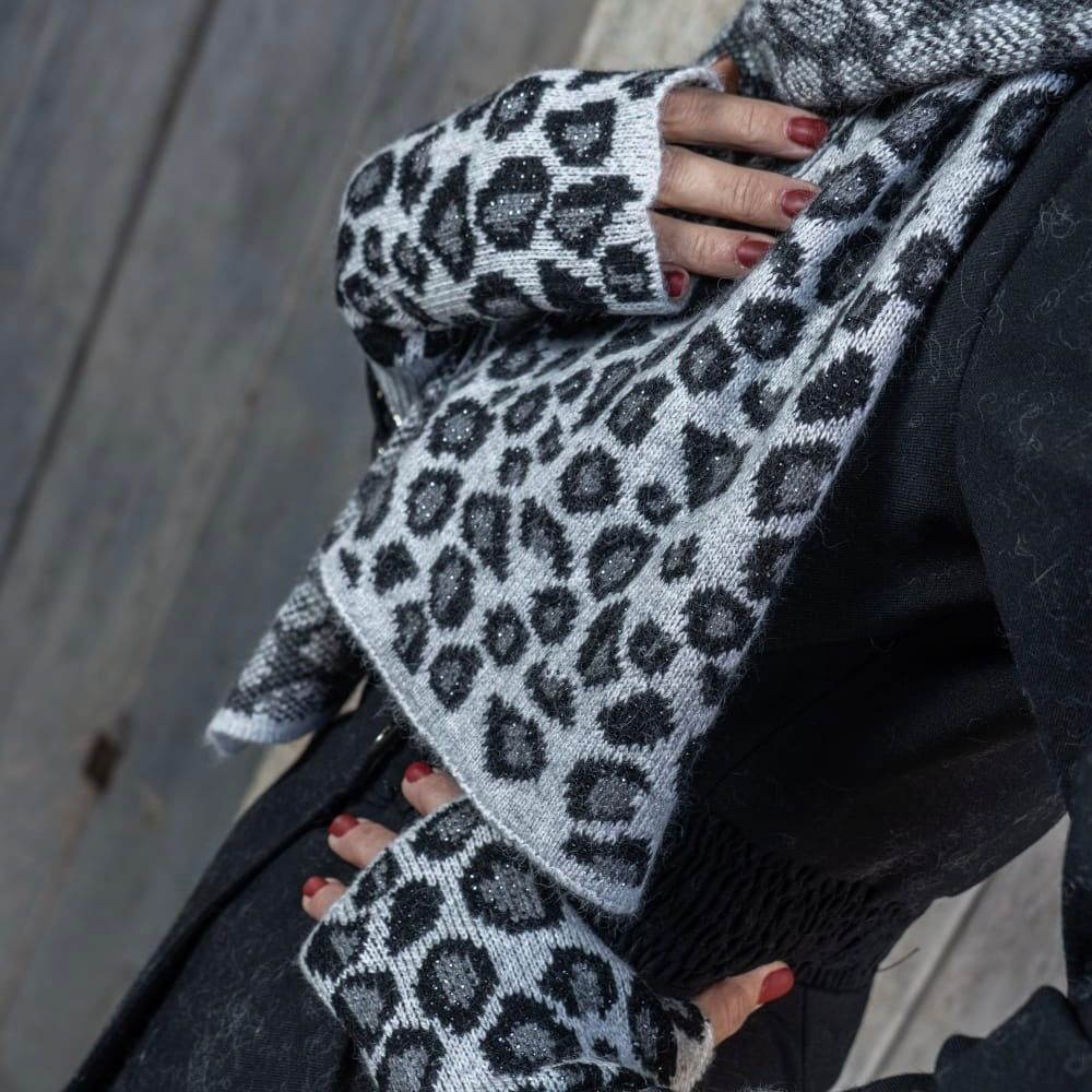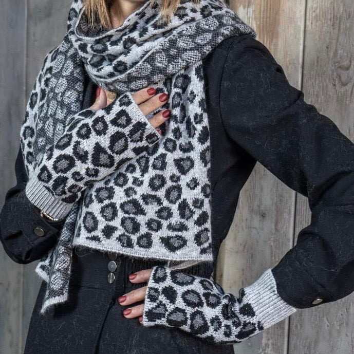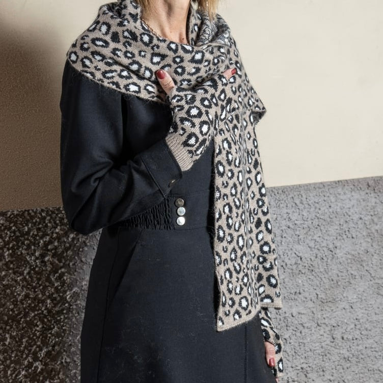 Sciarpa calda in viscosa e 8% angora in fantasia maculata con micro-strass su base Beige e Grigia