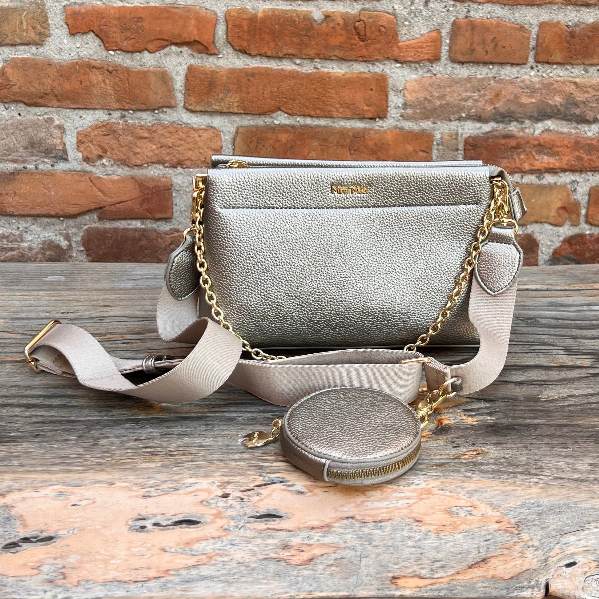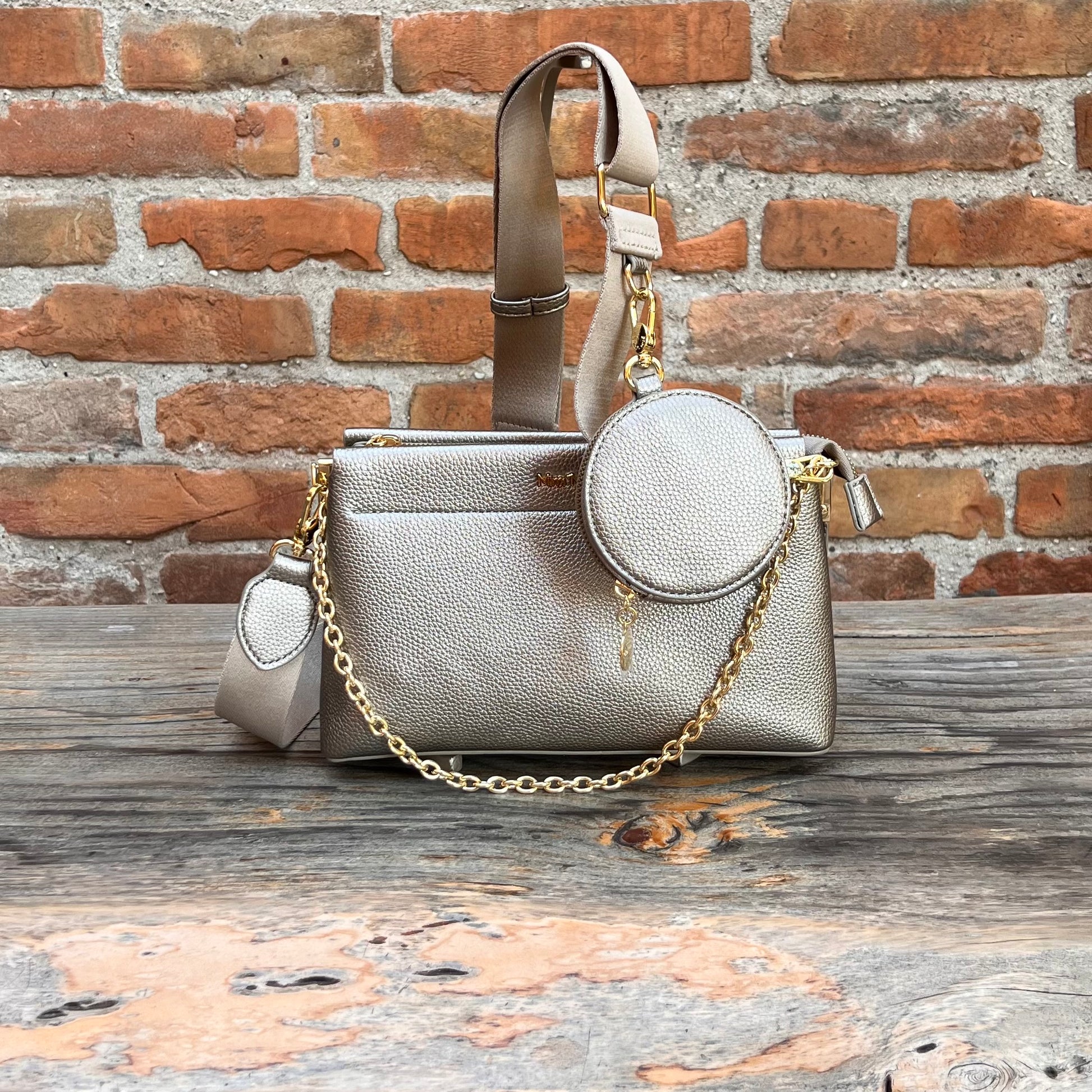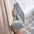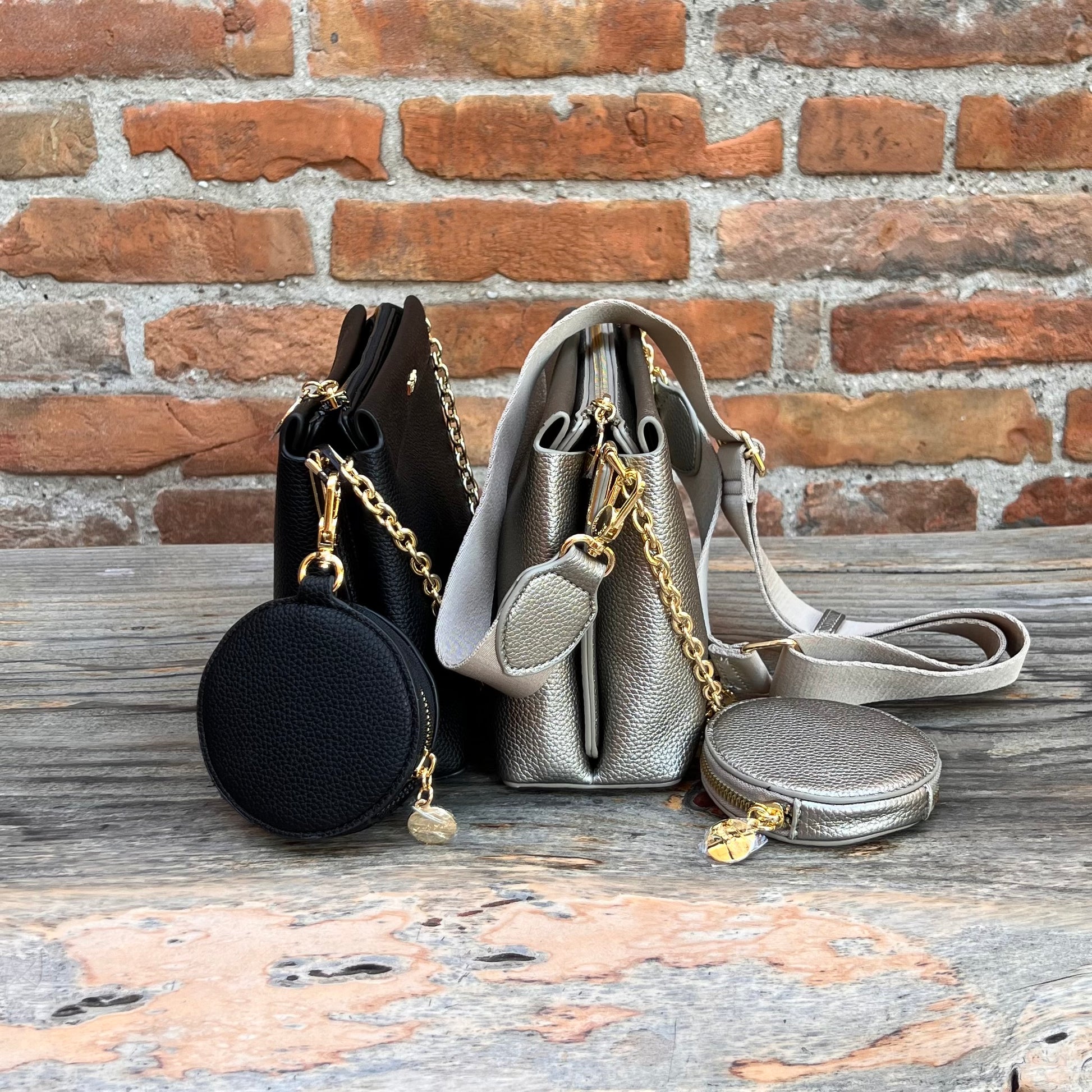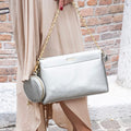 Borsa con catenella e tracolla regolabile e staccabile, portamonete-portachiavi tondo da agganciare con moschettone disponibile Platino e Nero