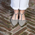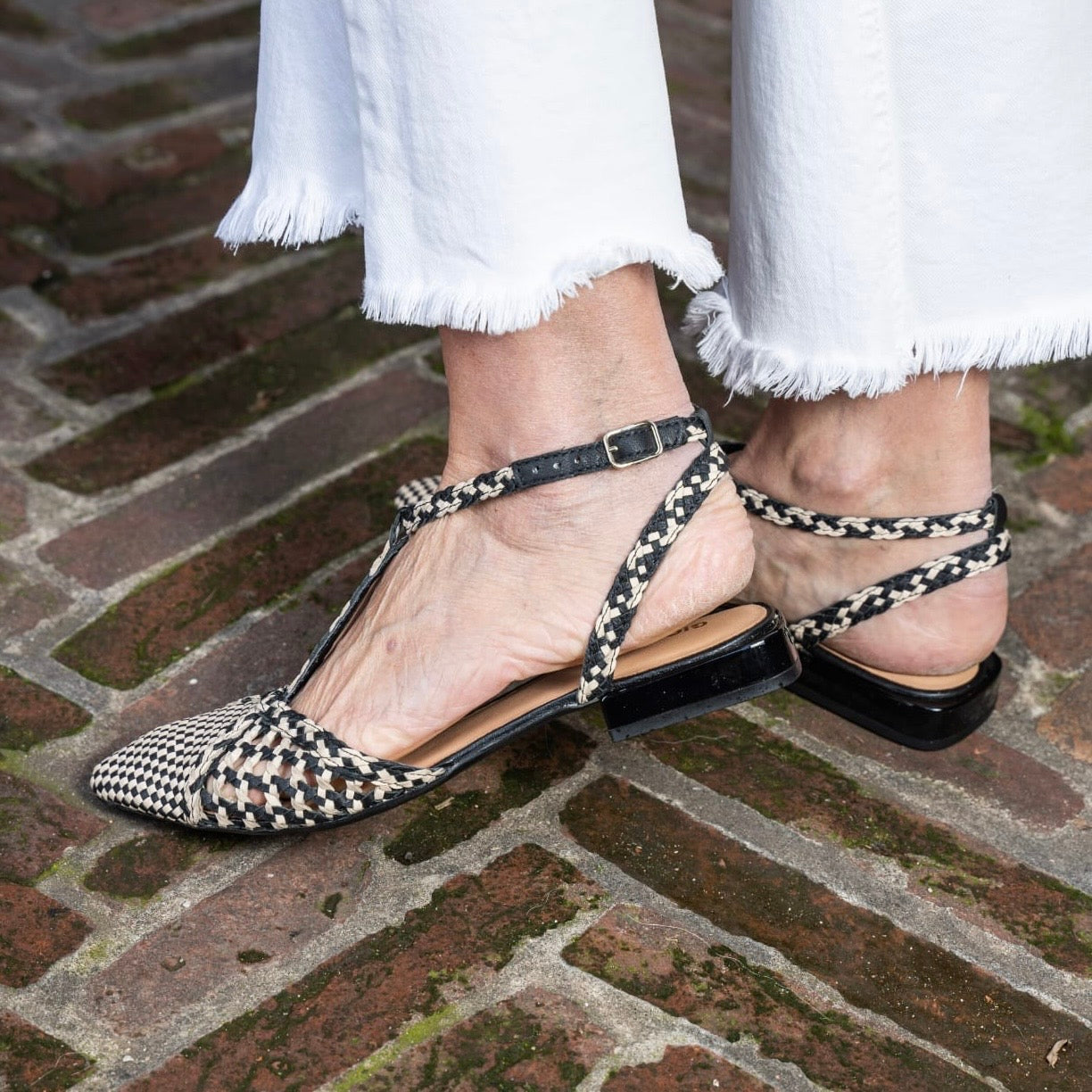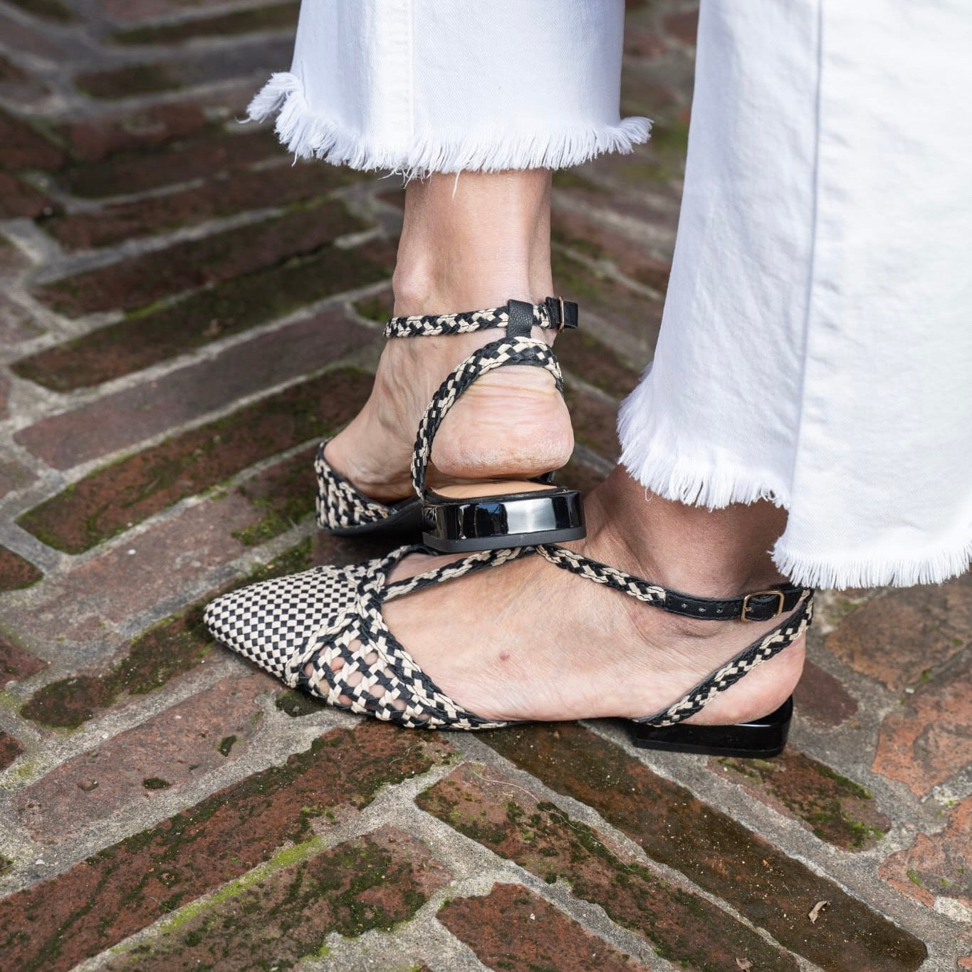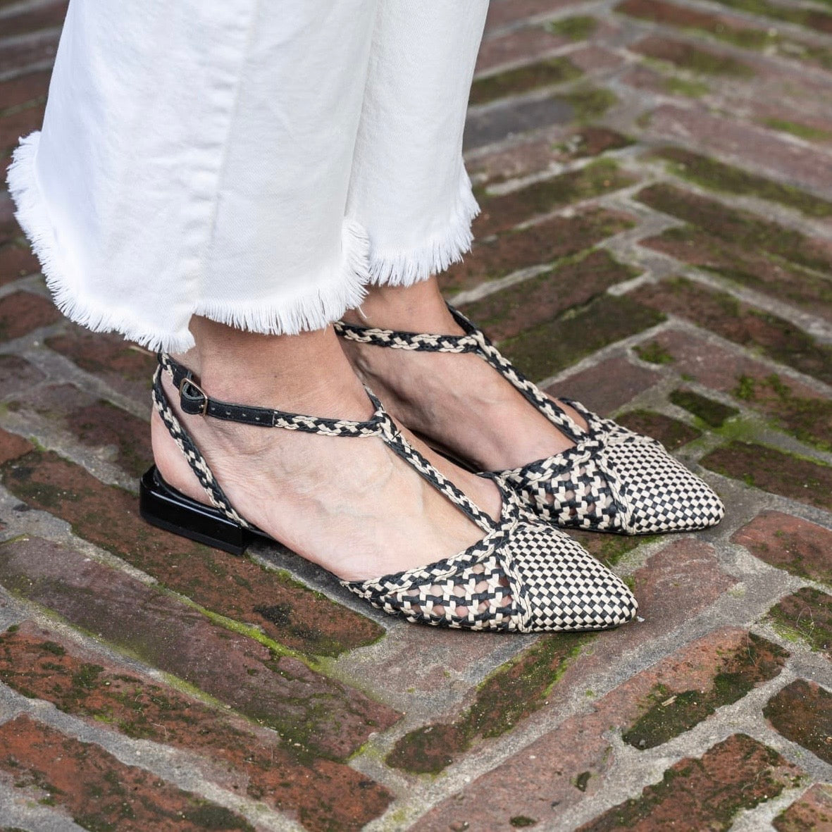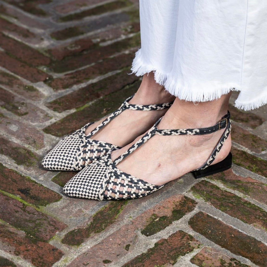Slingback punta affusolata con cinturino regolabile a T sul collo del piede, realizzata in pelle bicolore intrecciata a mano