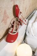 Slingback originale ed insolita con doppi cinturini, entrambi regolabili, realizzata in pregiato pellame nappa con profili a contrasto