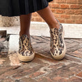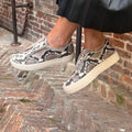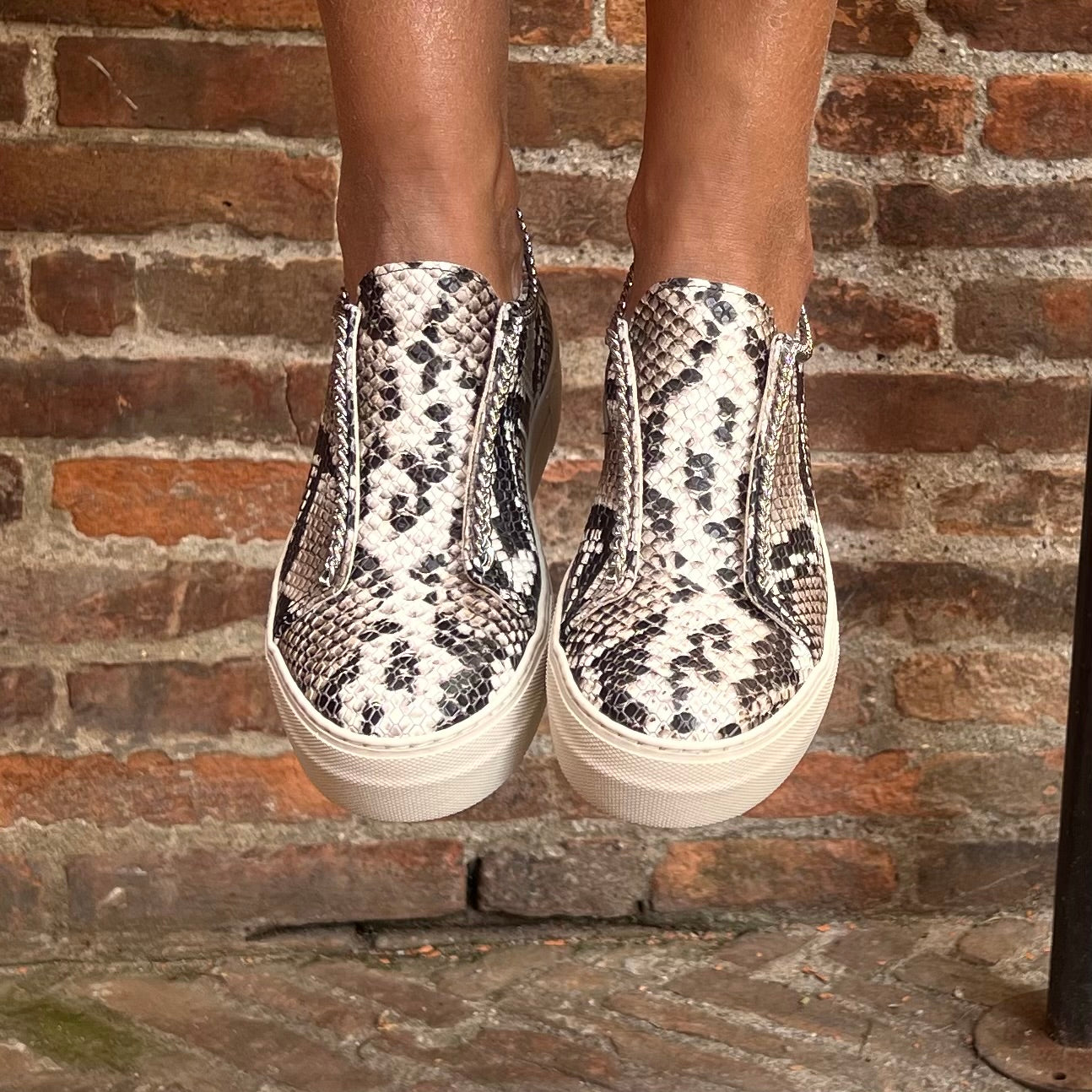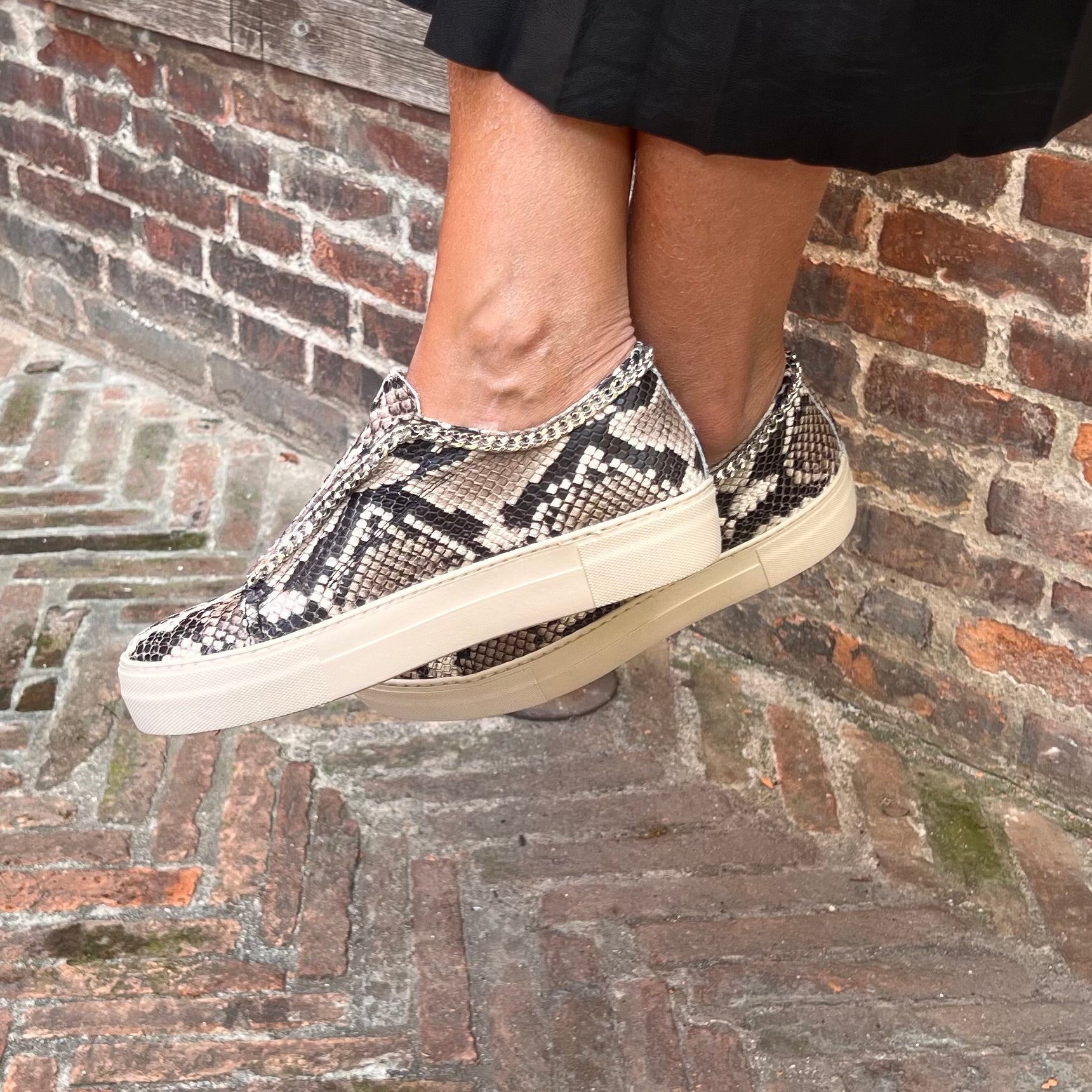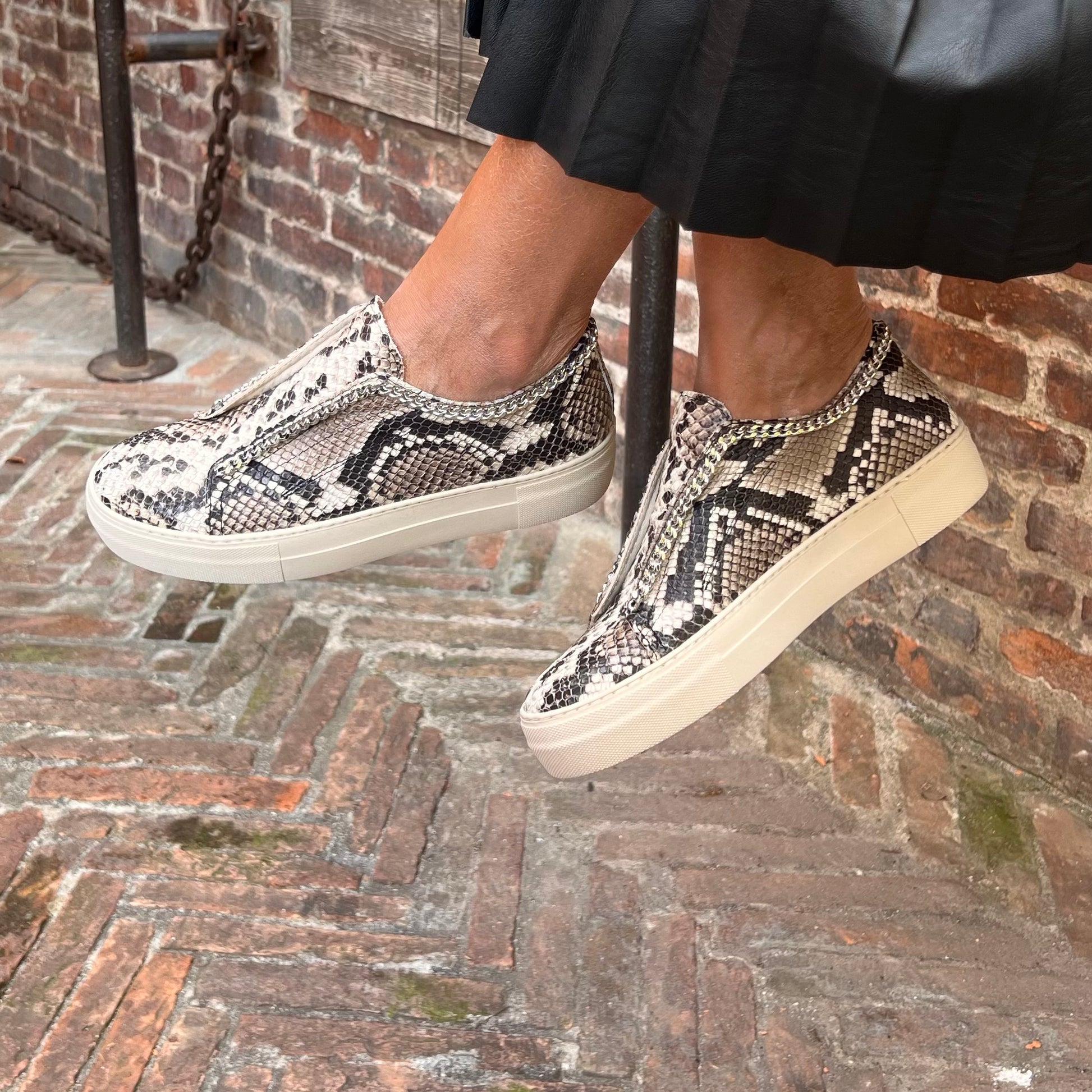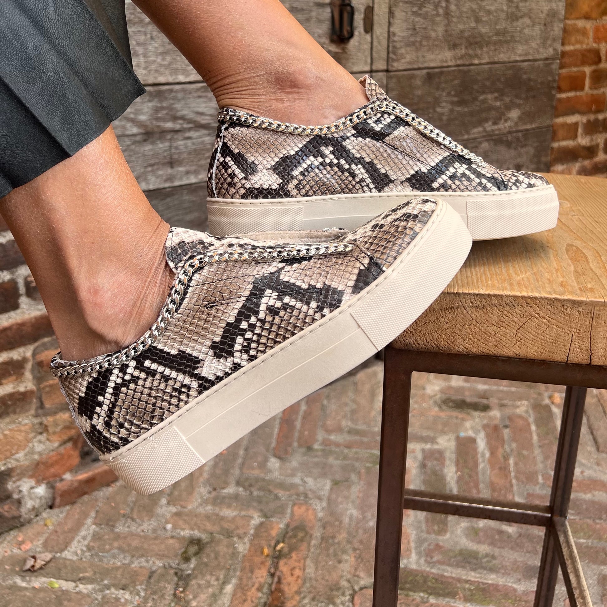 Sneaker modello slip-on in vitello stampa pitone color roccia con dettaglio catena argento