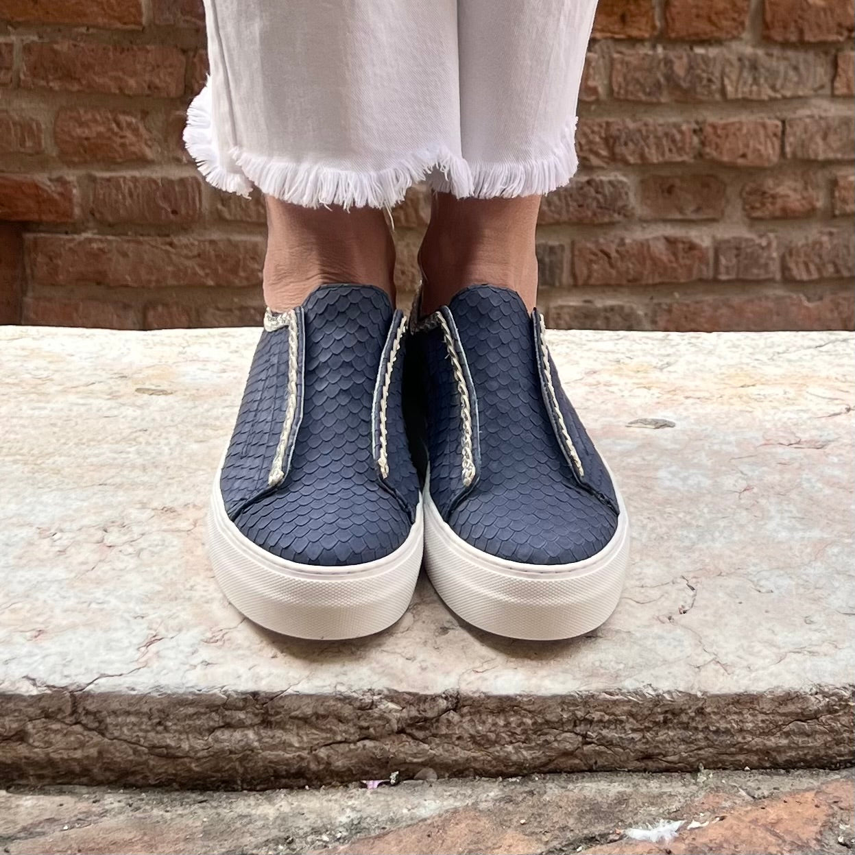 Sneaker modello slip-on in vitello stampa squama blu con dettaglio treccina argento.Perfetta per chi desidera la comodità della sneaker senza allacciatura