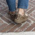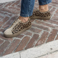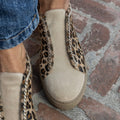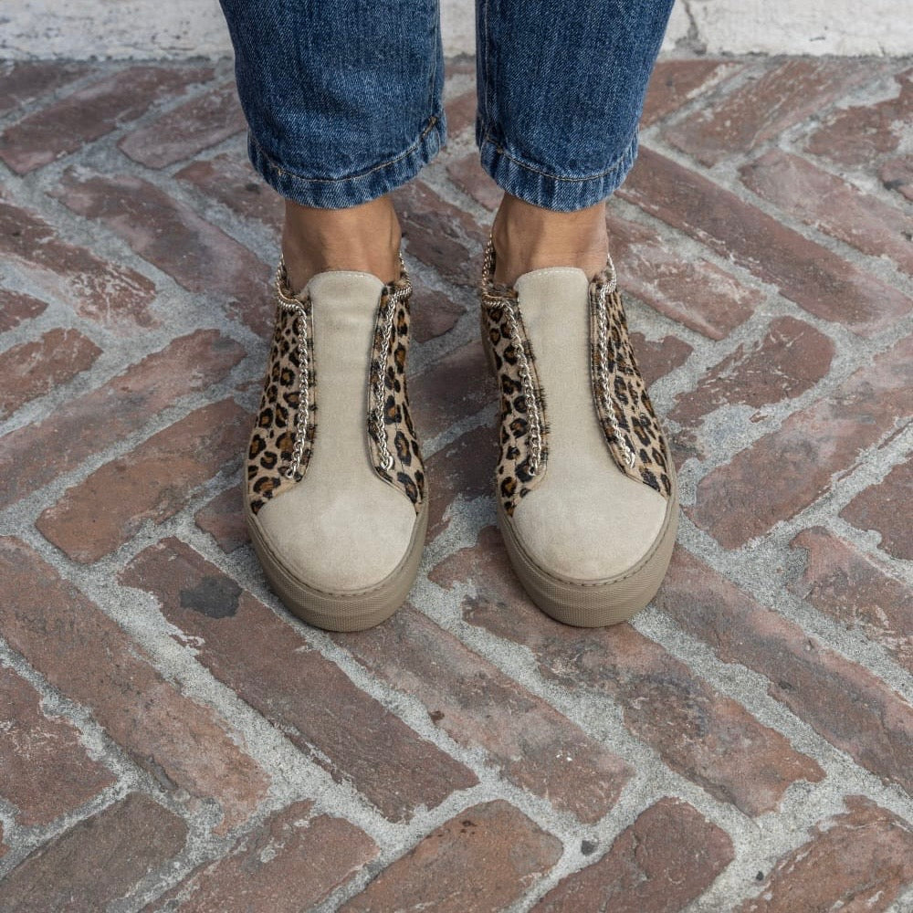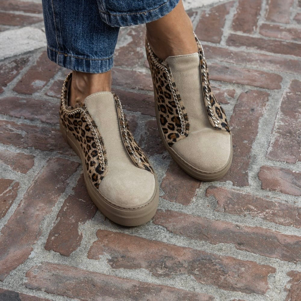 Sneaker modello slip-on in cavallino maculato e camoscio beige con dettaglio catena oro