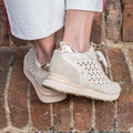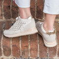 Sneakers laserate traforate con inserti in pelle scamosciata, plateau foderato e zeppa interna