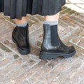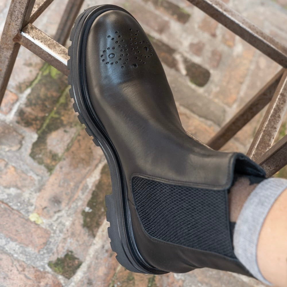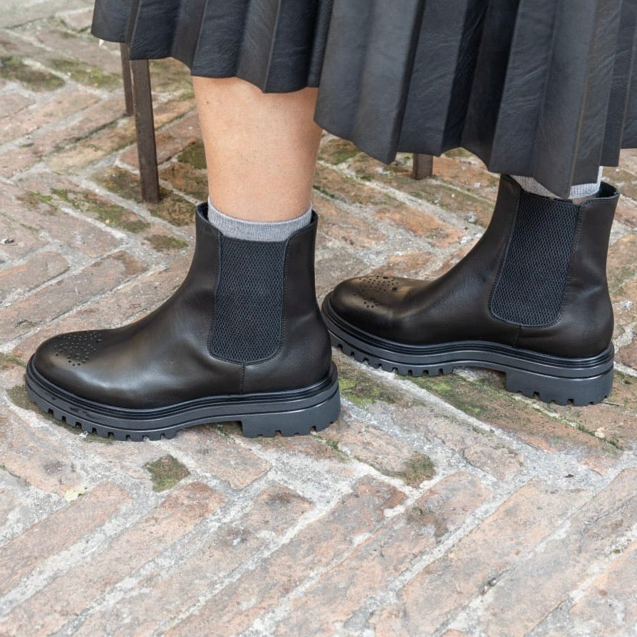 Stivaletto modello Beatles: un classico intramontabile.Dettaglio impuntura all’inglese sulla tomaia, realizzato in morbido vitello nero
