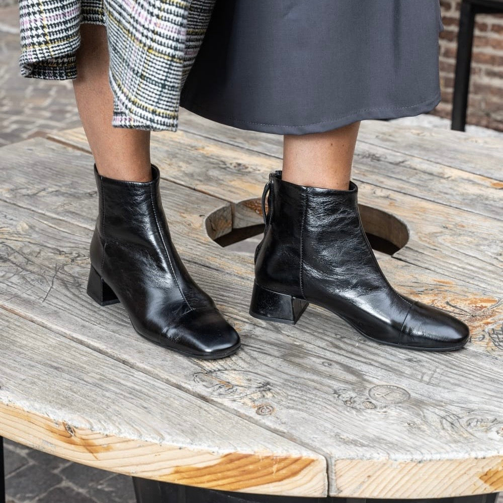 Stivaletto linee pulite ed essenziali che richiama gli anni ‘80 in chiave moderna, realizzato in morbidissima nappa verniciata nera con zip posteriore perfetto anche con gonne ed abiti