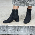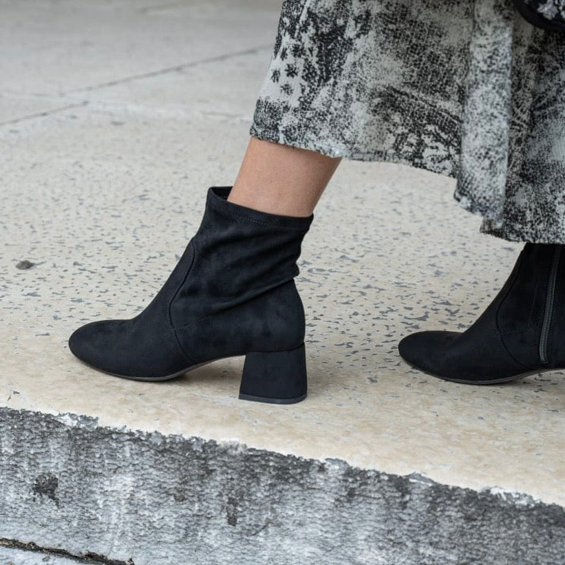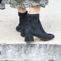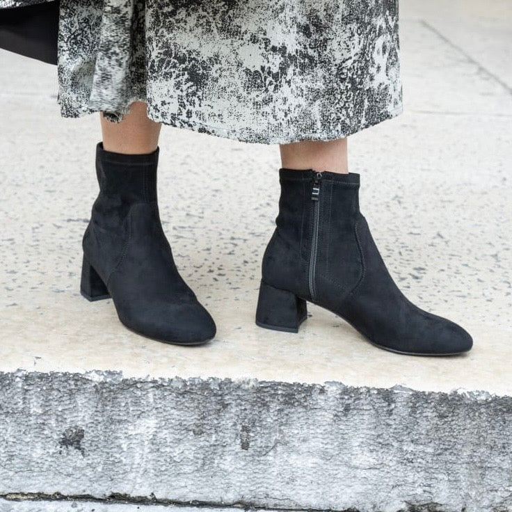 Stivaletto punta arrotondata e full zip, in tessuto elasticizzato effetto camoscio disponibile nero