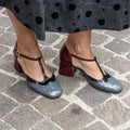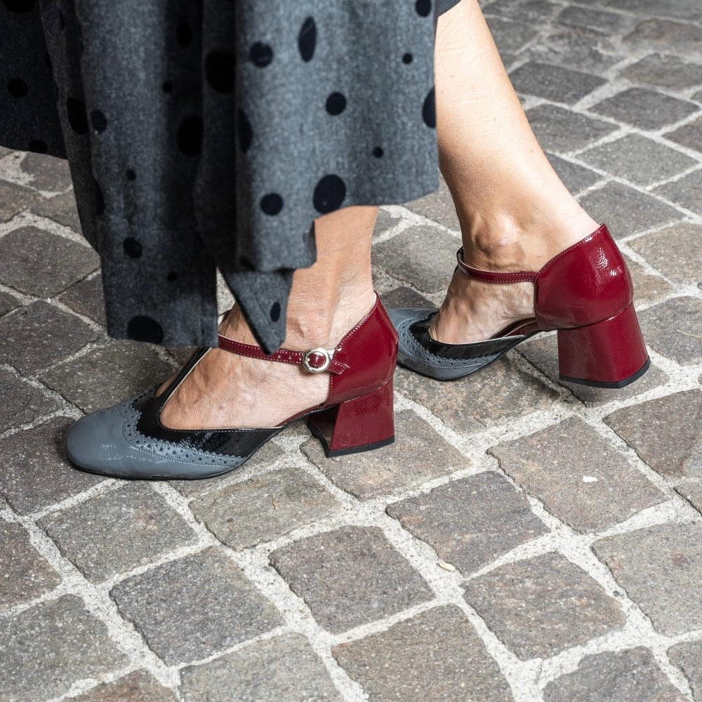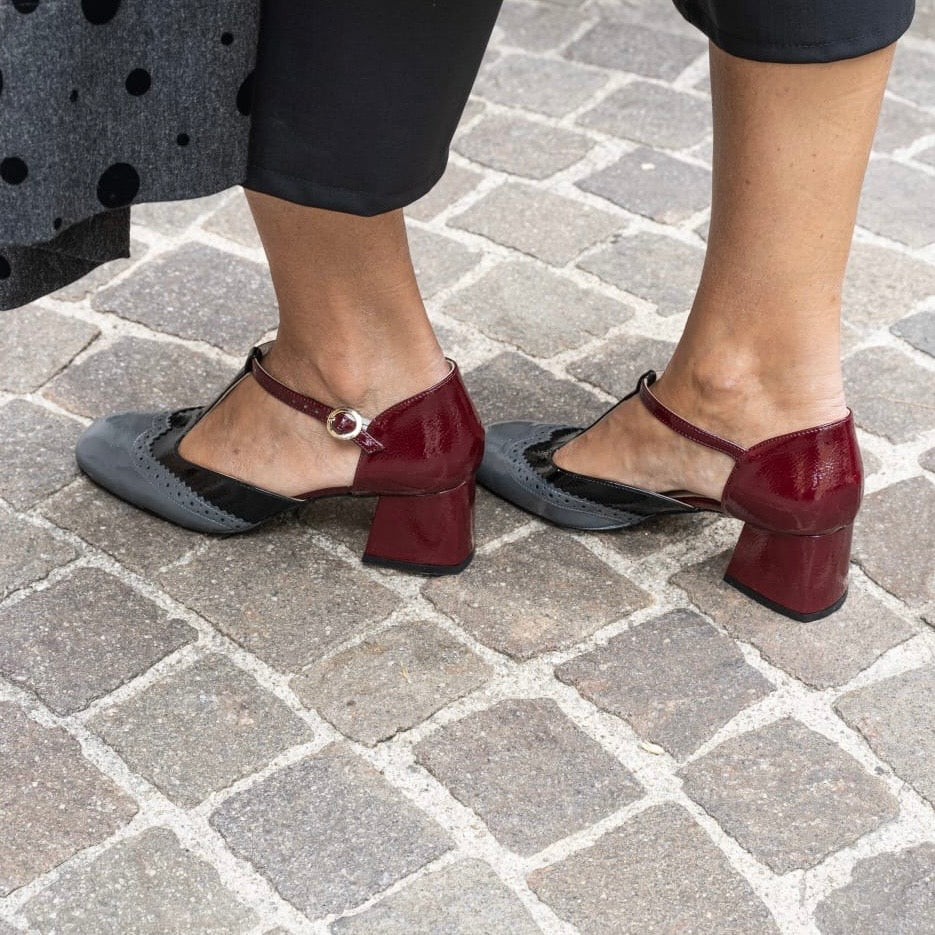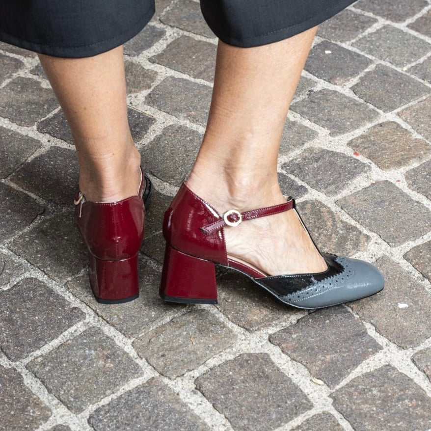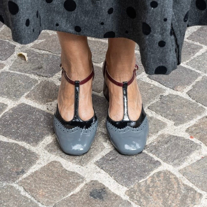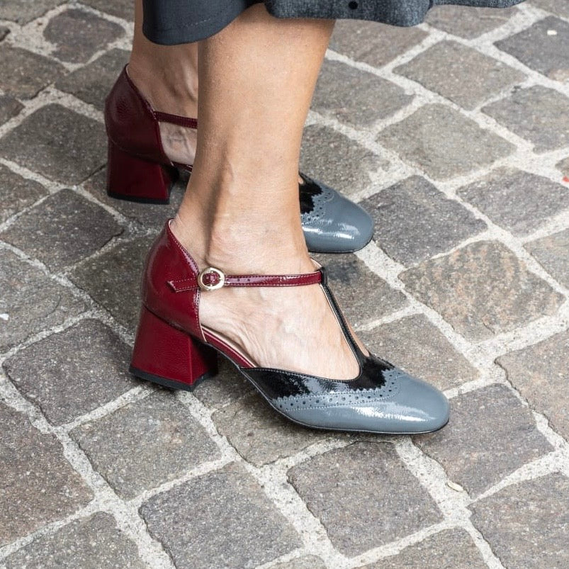 Il modello must have in una nuova versione con i colori di grandissima tendenza per questa stagione realizzato in vernice grigio, nero e bordeaux