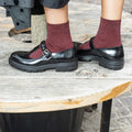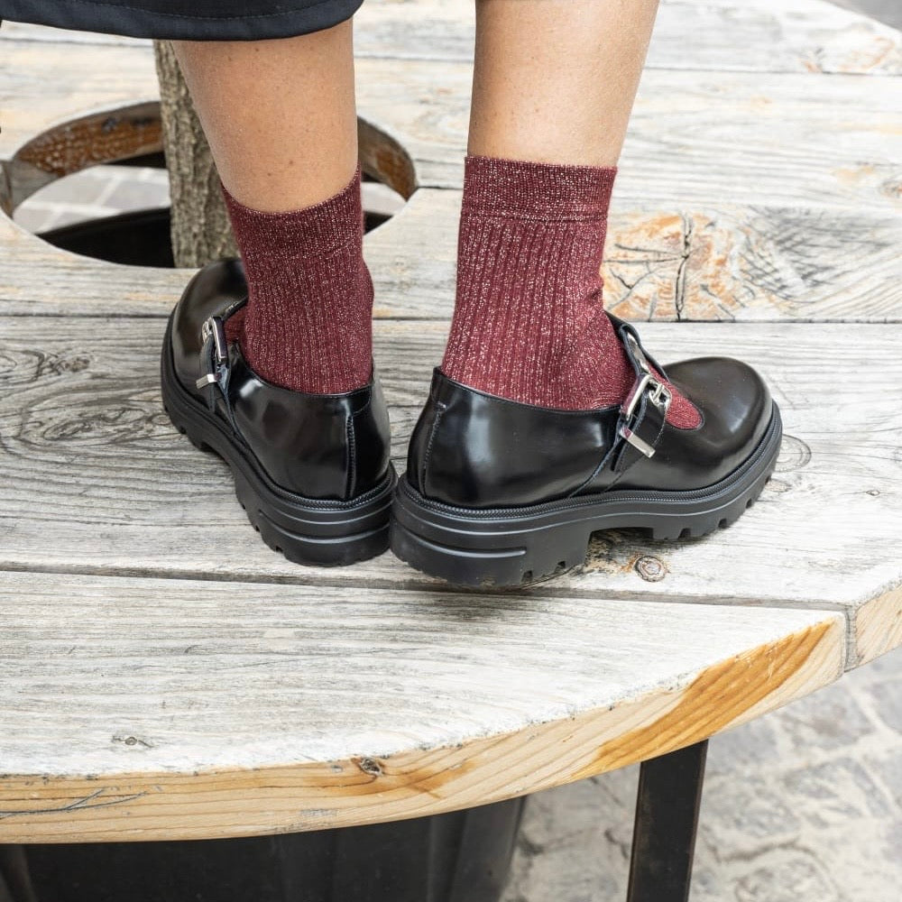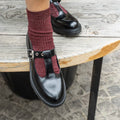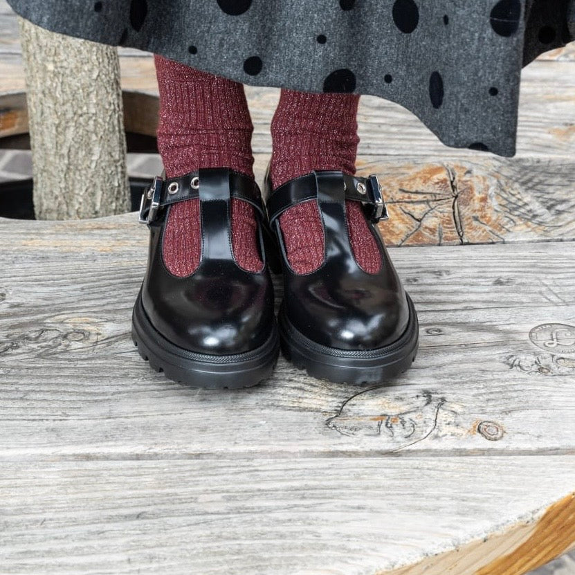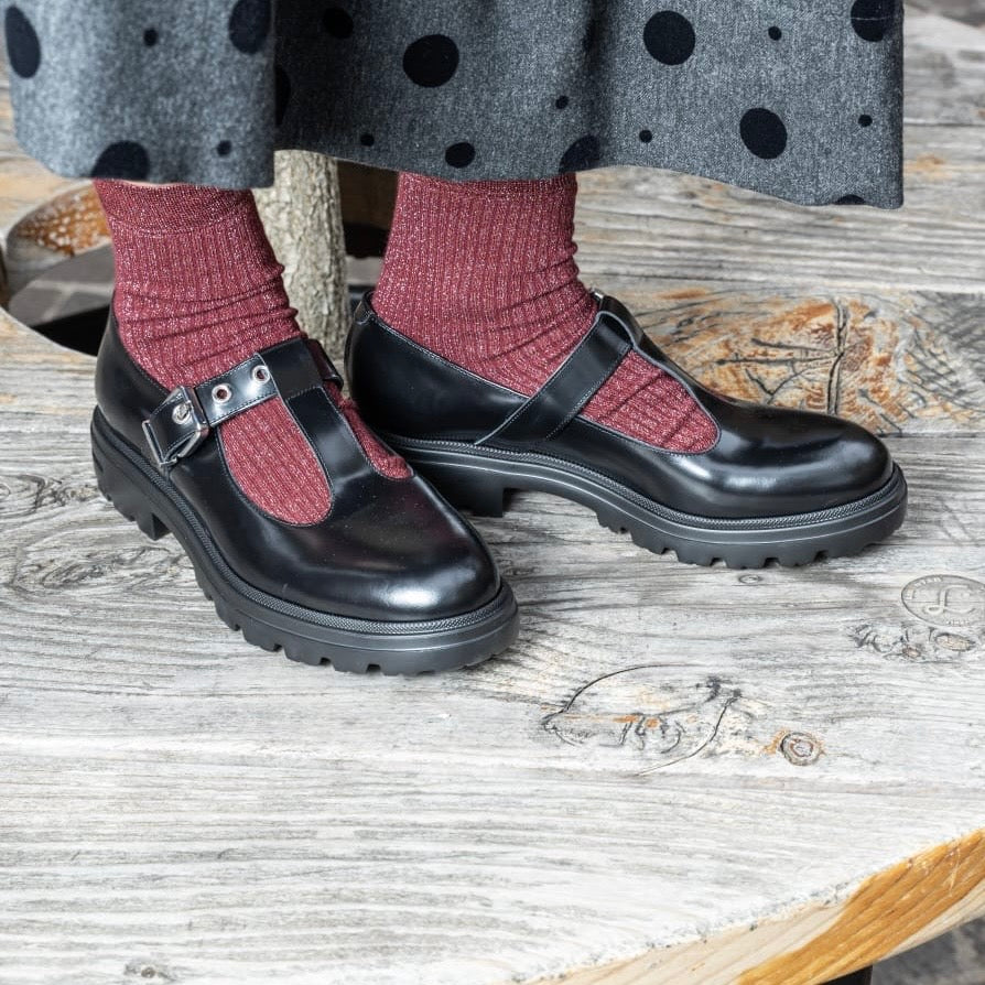 T-bar grintosa per un tocco glamour rock ai nostri outfits realizzata in vitello spazzolato con occhielli a contrasto