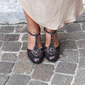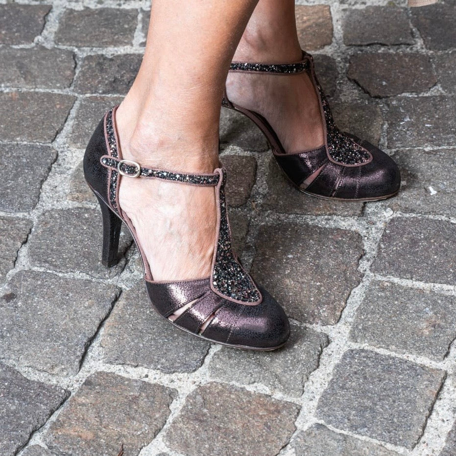 T-bar scintillante con centrale a goccia in prezioso cristallo multicolore, realizzata a mano con tomaia in camoscio cosmos testa di moro. Interamente orlata a mano in gros-grain